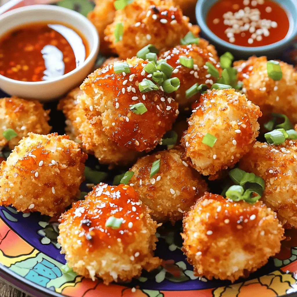 Once cooked, transfer the chicken bites to a large mixing bowl. Pour in 1/2 cup of sweet chili sauce. If you want more heat, add 2 tablespoons of sriracha. Toss the chicken bites well, making sure every piece is coated in sauce. Place the spicy sweet chili chicken bites on a serving platter. For a fun touch, garnish with chopped green onions and sesame seeds. Enjoy these bites with extra sweet chili sauce on the side for dipping!