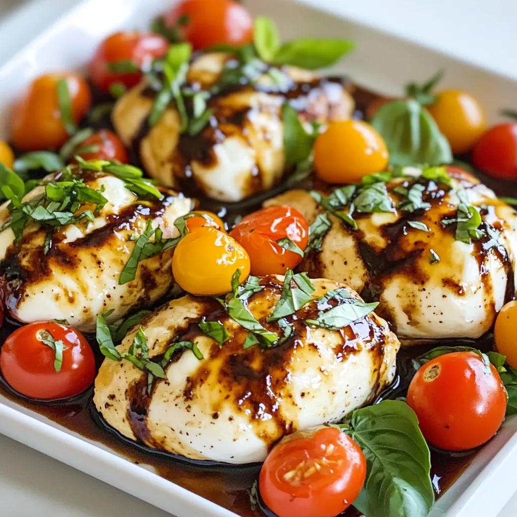A delicious chicken dish topped with fresh mozzarella, cherry tomatoes, and basil, drizzled with balsamic glaze.