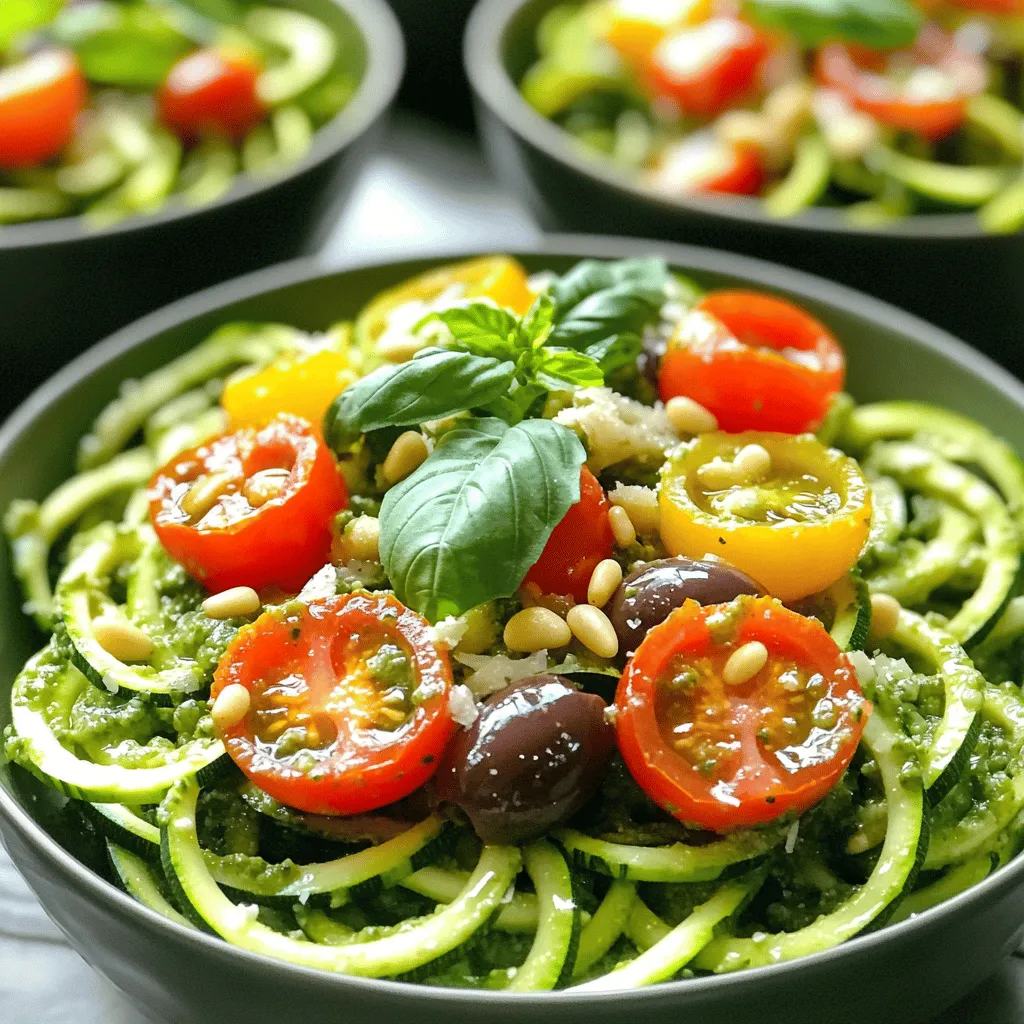 To make a tasty Basil Pesto Zucchini Noodle Salad, gather these fresh, simple ingredients: - 3 medium zucchinis, spiralized into noodles - 1 cup fresh basil leaves - 1/3 cup pine nuts, lightly toasted - 2 cloves garlic - 1/2 cup grated Parmesan cheese or nutritional yeast for a vegan option - 1/3 cup olive oil - Salt and pepper to taste - 1 cup cherry tomatoes, halved - 1/4 cup Kalamata olives, sliced (optional) - 1 tablespoon lemon juice These ingredients bring bright, fresh flavors to your dish. The zucchini noodles serve as a healthy base. Fresh basil gives the salad its signature taste. Pine nuts add a nice crunch, while garlic gives depth. Using grated Parmesan enhances the creaminess. If you're vegan, nutritional yeast is a great substitute. Olive oil ties everything together, making the salad rich and smooth. Cherry tomatoes add sweetness, while Kalamata olives give a slight briny touch. The lemon juice brightens the whole dish. With these ingredients, you can create a vibrant, healthy salad that is perfect for any meal. To start, you need a spiralizer. This tool turns zucchinis into thin, noodle-like strands. If you don’t have one, you can use a box grater or a vegetable peeler. - Use a spiralizer for the best texture. - Make sure to choose firm zucchinis. This helps the noodles hold their shape. Once you spiralize the zucchinis, place them in a large mixing bowl. You want to avoid excess moisture, so let them sit for a few minutes. This helps them dry out a bit. For the pesto, a food processor is best. It gives you a smooth texture. Gather these ingredients first: - 1 cup fresh basil leaves - 1/3 cup pine nuts (lightly toasted) - 2 cloves garlic - 1/2 cup grated Parmesan cheese (or nutritional yeast for a vegan option) - 1/3 cup olive oil - Salt and pepper to taste Add the basil, pine nuts, garlic, and cheese to the food processor. Pulse until everything is finely chopped. Then, while blending, slowly pour in the olive oil. This step makes the pesto creamy and smooth. Season with salt and pepper to taste. Now, it’s time to put everything together. Pour the basil pesto over the zucchini noodles. Gently toss to coat the noodles, ensuring they are well covered. Next, add in these: - 1 cup cherry tomatoes, halved - 1/4 cup Kalamata olives, sliced (optional) - 1 tablespoon lemon juice Mix these ingredients in gently. This adds color and flavor to your salad. Before serving, taste and adjust the seasoning. You might want more salt, pepper, or lemon juice. For the best flavor, let the salad sit for about 10 minutes. This time allows the noodles to soak up the tasty pesto. Enjoy your fresh and vibrant Basil Pesto Zucchini Noodle Salad! To boost flavor in your Basil Pesto Zucchini Noodle Salad, try adding some nuts or herbs. Chopped walnuts or almonds work well in the pesto. You can also toss in fresh parsley or arugula for a fresh taste. When seasoning, start with a pinch of salt and pepper. Taste as you go, and adjust until it feels just right. Serve this salad cold for the best taste. Chill your bowls in the fridge before serving. For a beautiful look, layer the salad with zucchini noodles and colorful tomatoes. Top it off with more basil leaves and a sprinkle of cheese. This makes a stunning dish that is sure to impress. Zucchini is low in calories and high in water. It’s great for hydration and full of vitamins. Basil is rich in antioxidants and can boost your immune system. If you use nutritional yeast instead of cheese, it keeps the dish vegan and adds B vitamins. This salad is also gluten-free, making it a healthy choice for many diets. {{image_2}} To make this salad vegan, simply swap the cheese. I recommend using nutritional yeast. It gives a cheesy flavor without dairy. You can also try cashews or sunflower seeds in the pesto. They blend well and add creaminess. To make this dish heartier, add protein. Grilled chicken or shrimp works great. If you want a plant-based option, use tofu. Sauté the tofu until golden brown. This adds a nice crunch and flavor. For chicken or shrimp, grill or pan-sear them before adding to the salad. Seasonal veggies can make this salad even better. Instead of cherry tomatoes, try bell peppers or radishes. They add color and crunch. You can also use fresh herbs like parsley or cilantro. They give a different flavor and freshness. To keep your Basil Pesto Zucchini Noodle Salad fresh, store leftovers in the fridge. Place the salad in an airtight container. This will help keep the flavors intact. If you have some pesto left over, store that separately. It will last longer on its own. When reheating, use low heat. This helps keep the zucchini noodles from getting mushy. You can also eat the salad cold. It tastes great straight from the fridge. If you want to mix things up, add leftover salad to a wrap or blend it into a soup. This way, you create a new meal while enjoying your tasty leftovers! You can make zucchini noodles using a few simple tools. - Box Grater: Use the large holes to shred the zucchini. - Peeler: Slice the zucchini into thin ribbons. - Knife: Cut the zucchini into thin strips, resembling noodles. These methods work well and create delicious noodles. You can choose any method based on what you have at home. Yes, you can prepare this salad ahead of time. - Timing: Make the zucchini noodles and pesto a few hours before serving. - Storage: Keep them separate until you are ready to eat. - Flavor: Letting the salad sit for about 10 minutes before serving helps flavors blend. Avoid adding tomatoes and olives until just before serving to keep them fresh. If you don’t have pine nuts, several other options work well. - Walnuts: They add a nice, rich flavor. - Almonds: Use sliced or slivered for a crunchy texture. - Sunflower seeds: A great nut-free option that still tastes good. These substitutes will still give your pesto a tasty and creamy texture. Absolutely! This salad is great for meal prep. - Storage: Pack the zucchini noodles and p