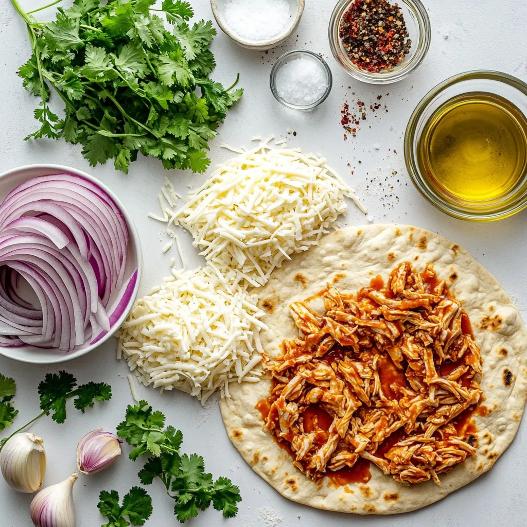 When I make BBQ chicken flatbread, I love to use simple, fresh ingredients. The first item is cooked chicken. I often shred leftover chicken. It saves time and adds great flavor. Next, I grab my favorite BBQ sauce. This ingredient gives the dish its signature taste. You can pick any brand you like.