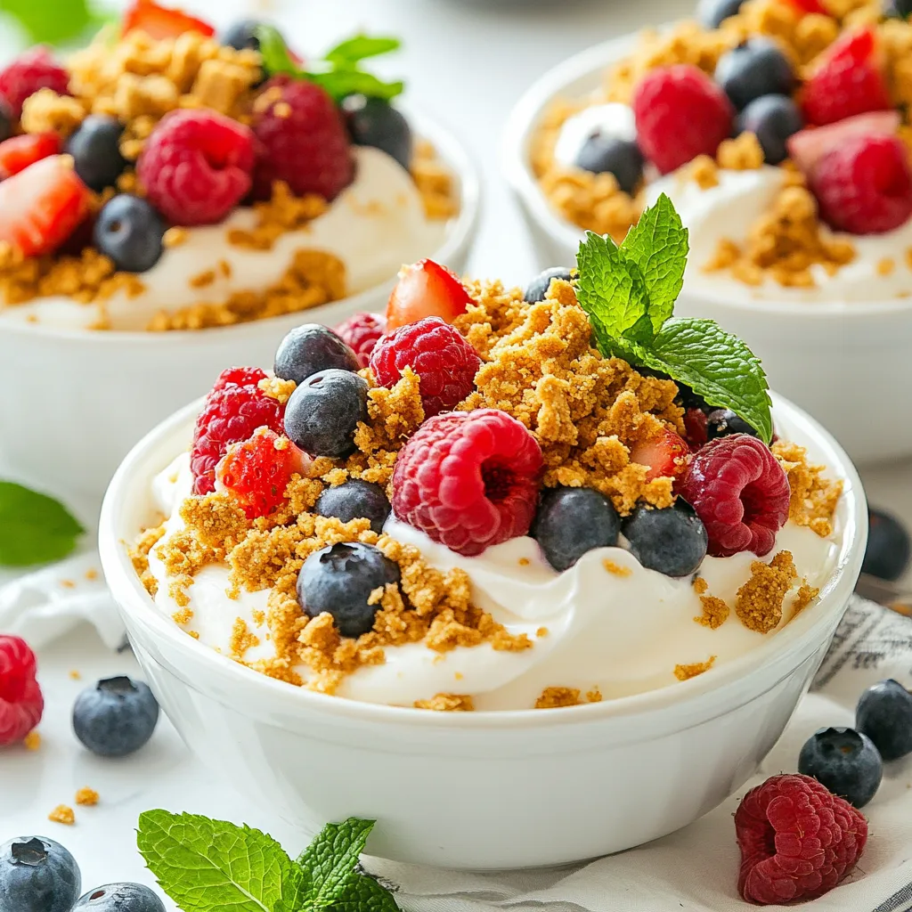 Now it’s time to assemble your salad. Find serving bowls or parfait glasses. Start with a layer of the berry cheesecake mixture at the bottom. Then, add a layer of graham cracker crumbs. Repeat these layers until you use all the mixture and crumbs. Finish with a sprinkle of graham cracker crumbs on top. For a nice touch, add a few fresh mint leaves for color and flavor. Finally, chill the salad in the fridge for at least 30 minutes. This waiting time helps the flavors mix well. Enjoy your delicious berry cheesecake salad!