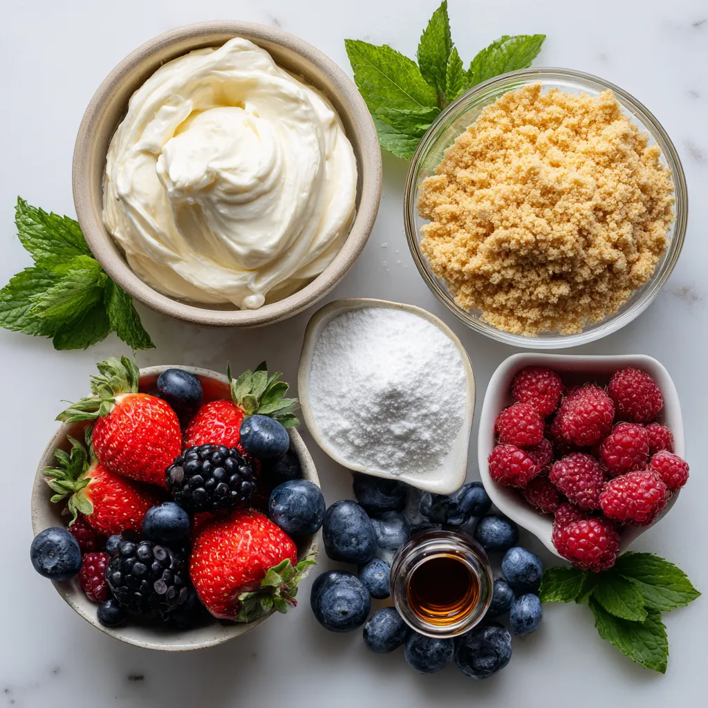 - 1 cup cream cheese, softened - 1/2 cup Greek yogurt - 1/2 cup powdered sugar - 1 teaspoon vanilla extract - 2 cups mixed berries (strawberries, blueberries, raspberries) - 1 cup graham cracker crumbs - Mint leaves for garnish You can swap cream cheese for mascarpone for a richer taste. If you want a lighter option, use low-fat cream cheese. Instead of Greek yogurt, regular yogurt works too. For sweetness, you can use honey or maple syrup instead of powdered sugar. If you don't have graham crackers, crushed cookies or even nuts make a great base. When picking berries, look for bright colors and firm texture. Avoid berries that look dull or mushy. Smell the berries; fresh ones should have a sweet scent. Check for any signs of mold. It’s best to buy organic when possible to avoid pesticides. Store them in the fridge, but don’t wash until you are ready to use them. This keeps them fresh longer. {{ingredient_image_1}} To start, gather your ingredients. You will need cream cheese, Greek yogurt, powdered sugar, and vanilla extract. First, take one cup of softened cream cheese and place it in a medium bowl. Then, add half a cup of Greek yogurt and half a cup of powdered sugar. Pour in one teaspoon of vanilla extract. Use an electric mixer to beat this mixture until it is smooth and creamy. This step makes the base for your cheesecake salad. Next, take two cups of mixed berries. You can use strawberries, blueberries, and raspberries. Place the berries in a large bowl. Gently fold the creamy mixture into the berries. Be careful not to squish them. You want each berry to be well coated but still whole. This step adds a burst of flavor to your salad and keeps it colorful. Now it’s time to assemble your salad. Find serving bowls or parfait glasses. Start with a layer of the berry cheesecake mixture at the bottom. Then, add a layer of graham cracker crumbs. Repeat these layers until you use all the mixture and crumbs. Finish with a sprinkle of graham cracker crumbs on top. For a nice touch, add a few fresh mint leaves for color and flavor. Finally, chill the salad in the fridge for at least 30 minutes. This waiting time helps the flavors mix well. Enjoy your delicious berry cheesecake salad! To make your berry cheesecake salad pop, use clear bowls or glasses. This way, you can show off the pretty layers. Start with the cheesecake mixture at the bottom. Then, add a layer of graham cracker crumbs. Next, pile on the mixed berries. Repeat these layers until you reach the top. Finish with a dollop of the cream cheese mix and a sprinkle of crumbs. Top it off with fresh mint leaves. This adds color and makes it look fancy. When mixing the cream cheese, it’s key to use a soft block. Let it sit at room temperature for about 30 minutes. This makes it easier to blend with yogurt and sugar. Use an electric mixer to get a smooth and creamy texture. Mix until there are no lumps. Then, gently fold in the berries. This avoids smashing them and keeps their shape. Be careful not to over-mix. You want those beautiful berries to shine. For the best cream cheese consistency, focus on temperature. Start with softened cream cheese. Cold cream cheese will not mix well. You can cut it into small pieces to soften faster. Beat it with Greek yogurt and powdered sugar until creamy. If it’s too thick, add more yogurt, a spoonful at a time. Mixing should be smooth, not runny. You want it creamy enough to hold the berries but light enough to enjoy. Pro Tips Use Fresh Berries: Using fresh, ripe berries will enhance the flavor and texture of your salad. Look for berries that are plump and fragrant for the best results. Chill for Flavor: Allowing the salad to chill in the refrigerator for at least 30 minutes helps the flavors meld together, resulting in a more delicious dessert. Variations: Feel free to mix in other fruits like sliced bananas or peaches for a unique twist. Just make sure they complement the berries. Presentation: Layer the salad in clear glasses to show off the colorful berries and graham cracker crumbs for an appealing presentation. {{image_2}} You can switch up the berries in this salad. Try blackberries, peaches, or even mangoes. Each fruit adds a unique taste. Mix and match to find your favorite. You can also add bananas for creaminess. Just remember to cut them into small pieces. If you want a twist, try different cream cheese bases. You can use mascarpone for a richer flavor. Ricotta cheese can give a lighter texture. Greek yogurt alone can make it lighter and tangy. Each option changes the taste. You can explore these bases based on what you like. To make this salad gluten-free, swap graham crackers for gluten-free crumbs. You can find many options in stores. Some brands offer delicious gluten-free cookies for this. Just crush them up to use as layers. This way, everyone can enjoy the dessert! To store leftover Berry Cheesecake Salad, use an airtight container. Place it in the fridge right after serving. This keeps the salad fresh and tasty. If you have individual servings, you can pack them in small containers too. Make sure to seal them well to prevent air from getting in. Chilling is key for this dessert. It helps the flavors blend and makes the salad cool and refreshing. After you make it, put the salad in the fridge for at least 30 minutes. For best results, chill it longer if you have time. Cover the salad with plastic wrap or a lid to keep it cold and delicious. The Berry Cheesecake Salad lasts up to three days in the fridge. After that, the berries may lose their texture. If you notice any signs of spoilage, like a change in color or smell, it’s best to toss it. Always trust your senses when it comes to food safety. Yes, you can make this salad in advance. It tastes even better after chilling. I suggest making it a few hours before you serve it. Just keep it in the fridge. This way, the flavors blend nicely. You can store it for up to two days. Mixed berries work best for this salad. I love