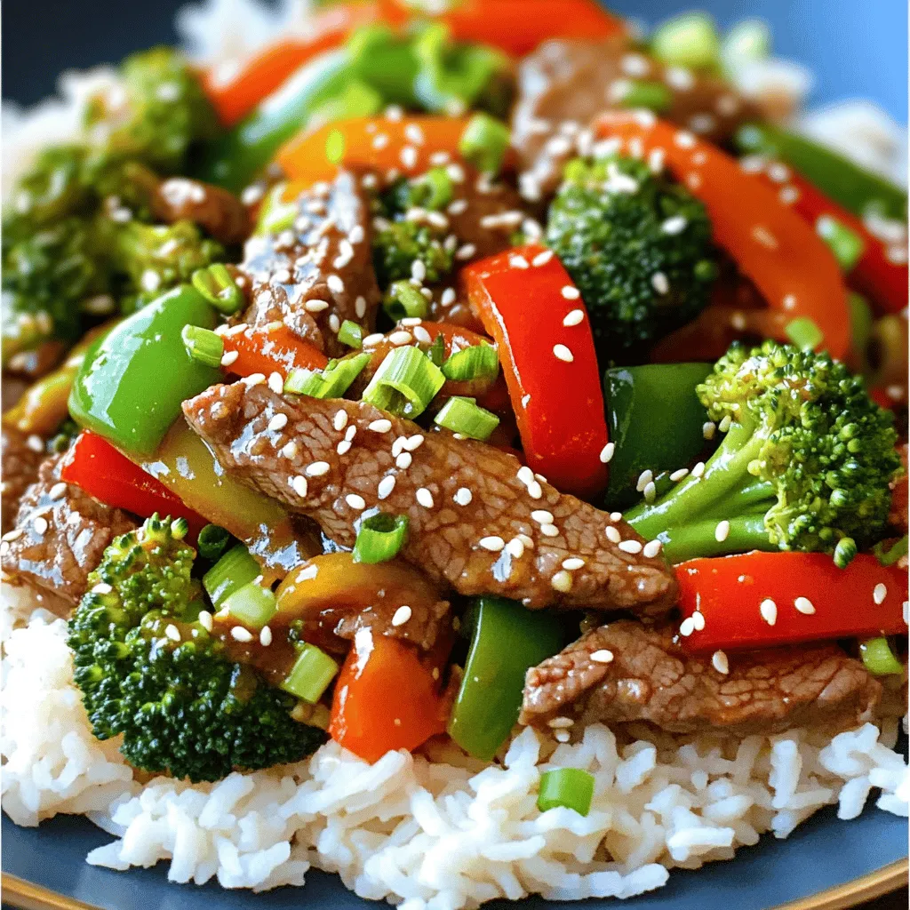 - 1 lb (450g) flank steak, thinly sliced against the grain - 1 red bell pepper, sliced - 1 green bell pepper, sliced - 1 cup broccoli florets Flank steak is tender and full of flavor. Slice it thinly to keep it juicy. Bell peppers add color and crunch. Broccoli gives a nice bite and is good for you. Together, these ingredients create a tasty base for our stir-fry. - 2 tablespoons soy sauce - 1 tablespoon oyster sauce - 1 tablespoon cornstarch - 1 tablespoon sesame oil Soy sauce brings saltiness and umami. Oyster sauce adds depth and sweetness. Cornstarch helps the meat stay tender and thickens the sauce. Sesame oil gives a nutty flavor that ties everything together. These sauces and seasonings elevate our dish to restaurant quality. - 2 green onions, chopped - Sesame seeds, for garnish Green onions add freshness and a mild kick. Sesame seeds bring a nice crunch and look pretty on top. These garnishes make your dish pop and taste even better. To start, we need to marinate the flank steak. In a medium bowl, mix the sliced beef with soy sauce, oyster sauce, and cornstarch. This step helps the beef soak up the flavors. Let it marinate for 15 to 20 minutes. Next, heat 1 tablespoon of vegetable oil in a large skillet over medium-high heat. Once hot, add the marinated beef in a single layer. Sear it for 2 to 3 minutes until it turns brown. This creates a nice crust. After that, remove the beef from the skillet and set it aside. Now it's time to cook the veggies. In the same skillet, add the other tablespoon of vegetable oil. Then, toss in the sliced red and green bell peppers along with the broccoli florets. Cook these for about 3 to 4 minutes. You want them to soften but still have some crunch. Once the veggies start to soften, add the minced garlic and grated ginger. Stir these in and cook for about a minute until they smell amazing. Now, return the cooked beef to the skillet. Pour in the sesame oil to bring all the flavors together. Stir everything to combine well. Cook for another 2 to 3 minutes until everything is hot. Finally, remove the skillet from heat. Garnish with chopped green onions and sesame seeds for added flavor and crunch. Serve this delicious stir-fry hot over cooked jasmine rice. Enjoy your meal! High heat is key for stir-frying. It cooks food fast and keeps it crisp. Use a large skillet or wok. Make sure the pan is very hot before adding ingredients. This helps sear the beef and veggies quickly. Stir often to prevent sticking. Keep everything moving for even cooking. To boost flavor, try adding a splash of rice vinegar or chili paste. You can also use garlic powder or onion powder for more taste. If you need a substitute for flank steak, use sirloin or chicken. For a vegetarian dish, try tofu or tempeh instead. A great plate makes food more appealing. Serve the stir-fry over a mound of jasmine rice. Use a large spoon to create a nice shape. For garnish, sprinkle chopped green onions and sesame seeds on top. A few slices of lime on the side add color and zest. {{image_2}} You can switch up the protein in this dish. If you prefer chicken, use thinly sliced chicken breast. It cooks quickly and stays tender. Just marinate it the same way as the beef. For a vegetarian option, try firm tofu. Press it to remove extra water, then cut it into cubes. You can pan-fry the tofu until golden before adding it to the stir-fry. Both options work well with the sauces and spices. Feel free to mix in more vegetables. Carrots, snap peas, or mushrooms can add nice texture and flavor. You can also use seasonal veggies. In spring, add asparagus; in fall, try sliced zucchini or butternut squash. Just remember to cut them into similar sizes for even cooking. This makes the dish colorful and healthy. While jasmine rice is great, you can serve this stir-fry with other rice types. Brown rice adds a nutty flavor, while sushi rice gives a sticky texture. If you want a change, try serving it over noodles. Udon or rice noodles work well. Just follow the cooking instructions on the package. This adds a fun twist and can change the meal completely. Store leftovers in an airtight container. This keeps them fresh and tasty. Place the container in the fridge. Your stir-fry will last for up to three days. Make sure to cool the dish to room temperature before sealing it. This helps prevent moisture build-up. For longer storage, you can freeze the stir-fry. Use a freezer-safe container or bag. Remove as much air as possible to avoid freezer burn. Your stir-fry can last up to three months in the freezer. When ready to eat, thaw it overnight in the fridge. For quick reheating, you can microwave it or sauté it in a skillet until hot. You can prepare this dish in advance. Marinate the beef the night before for better flavor. Chop your veggies ahead of time to save on cooking time. Divide portions into single-serving containers for easy meals. This way, you can enjoy a quick, healthy dinner anytime! Yes, you can use other cuts of beef for this stir-fry. Here are some good options: - Sirloin Steak: This cut is lean and tender. It cooks quickly and tastes great. - Ribeye Steak: It has more fat, which adds flavor. It makes the dish rich and juicy. - Round Steak: This is a leaner option. It may need a little extra marinating for tenderness. When choosing a cut, aim for something that cooks fast and stays tender. To make this dish gluten-free, swap out certain sauces: - Soy Sauce: Use tamari, which is a gluten-free soy sauce. - Oyster Sauce: Look for a gluten-free brand or make a homemade version. Also, check that your cornstarch is gluten-free. Most brands are, but it's good to confirm. These swaps keep the flavor but avoid gluten. This stir-fry pairs well with a few sides: - Jasmine Rice: It absorbs the sauce and complements the beef. - Steamed Rice Noodles: They add a different texture. Toss them with soy sauce for extra flavor. - Light Drinks: Serve with green tea or a light beer to balance the meal. These choices enha