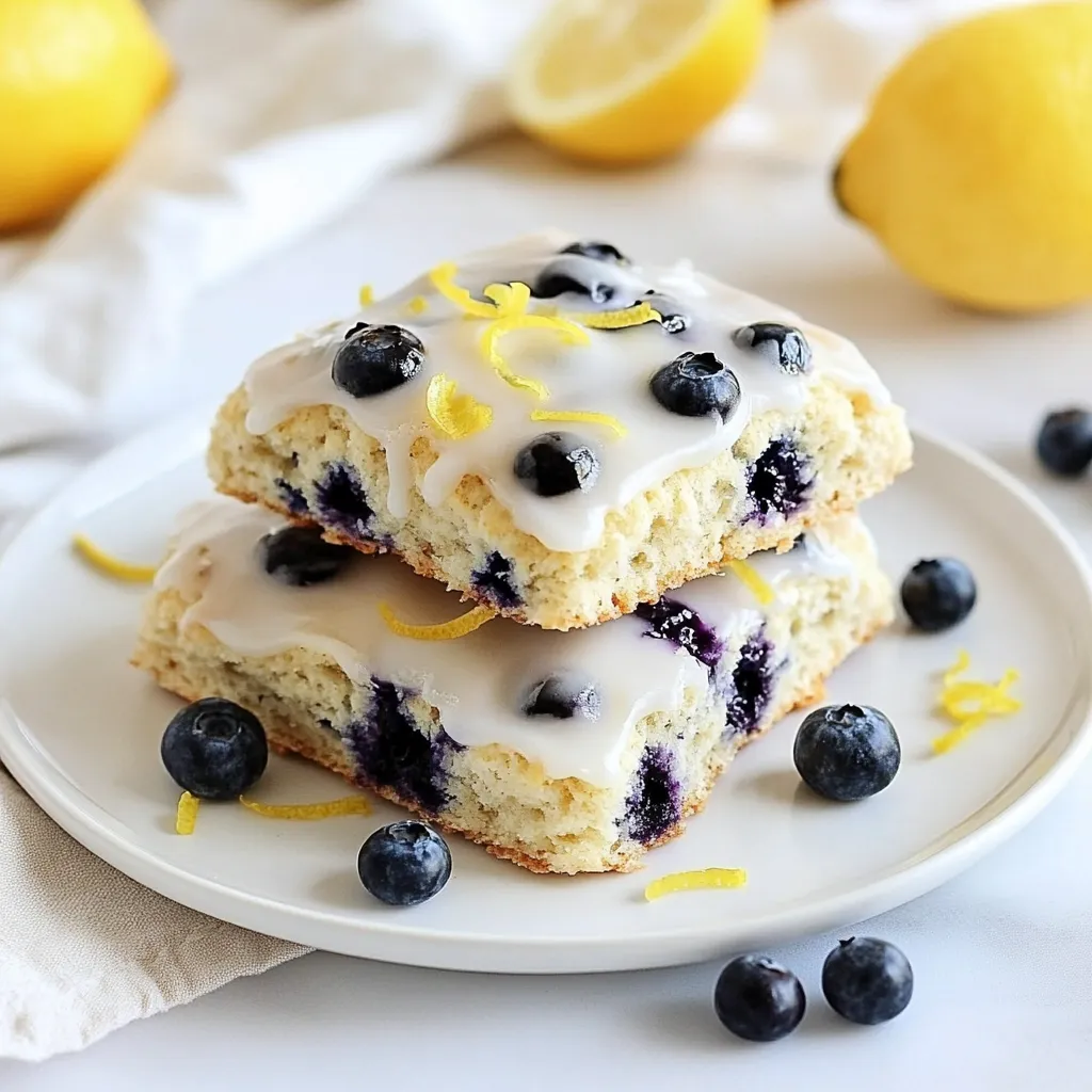Serve warm drizzled with a lemon glaze and garnished with lemon zest and blueberries.