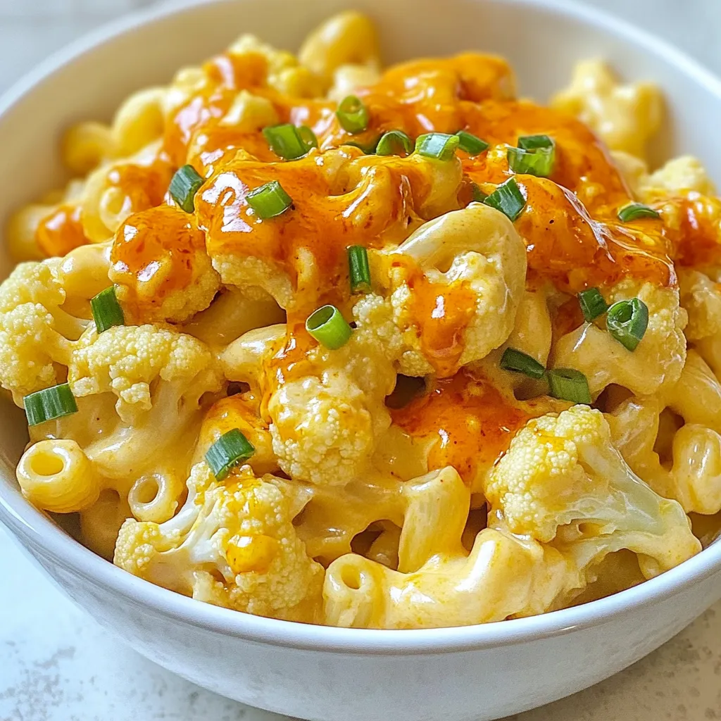 A spicy and creamy mac and cheese dish featuring roasted cauliflower and buffalo sauce.