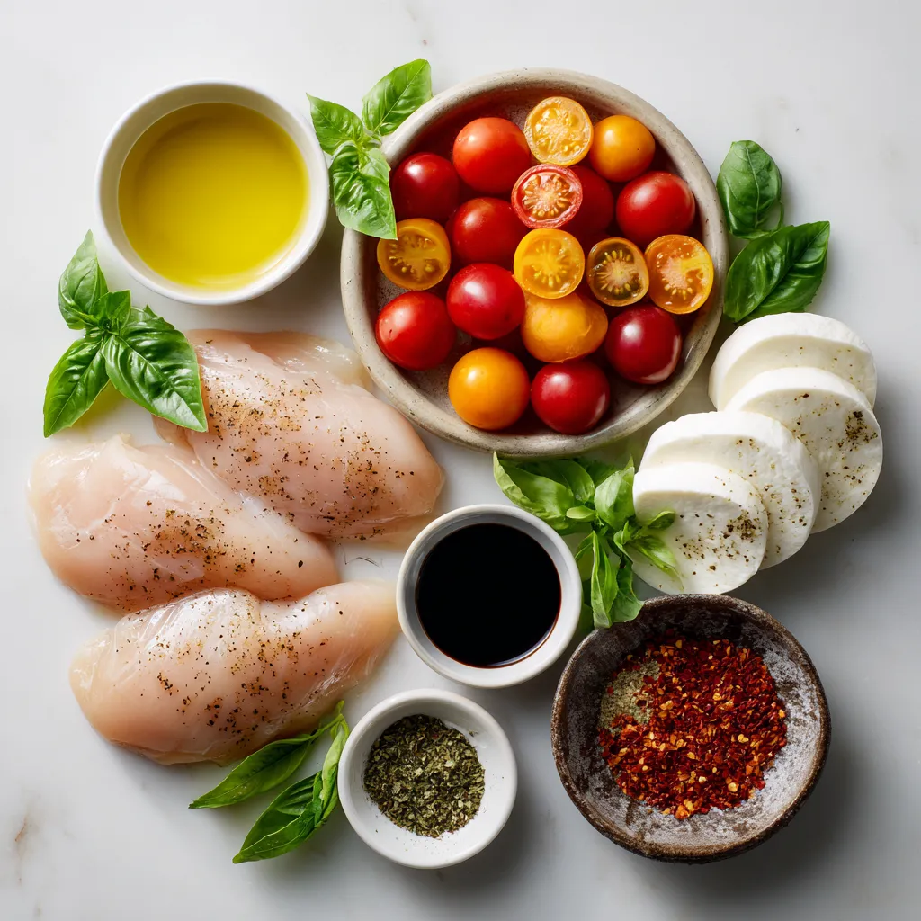 To make a great Caprese Chicken Skillet, you need simple yet fresh ingredients. Start with four boneless, skinless chicken breasts. These will be the star of your dish.