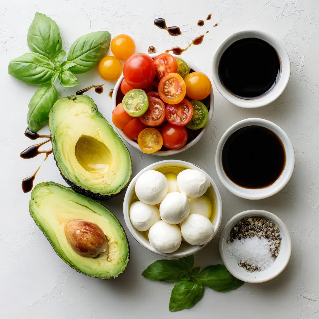 Using ripe avocados is key. They should feel soft when you gently squeeze them. The cherry tomatoes add a sweet burst of flavor. Fresh mozzarella brings a creamy texture. Basil leaves give it a fragrant touch. Balsamic glaze offers a nice sweetness. Extra-virgin olive oil adds richness. Lastly, salt and pepper will bring everything together.