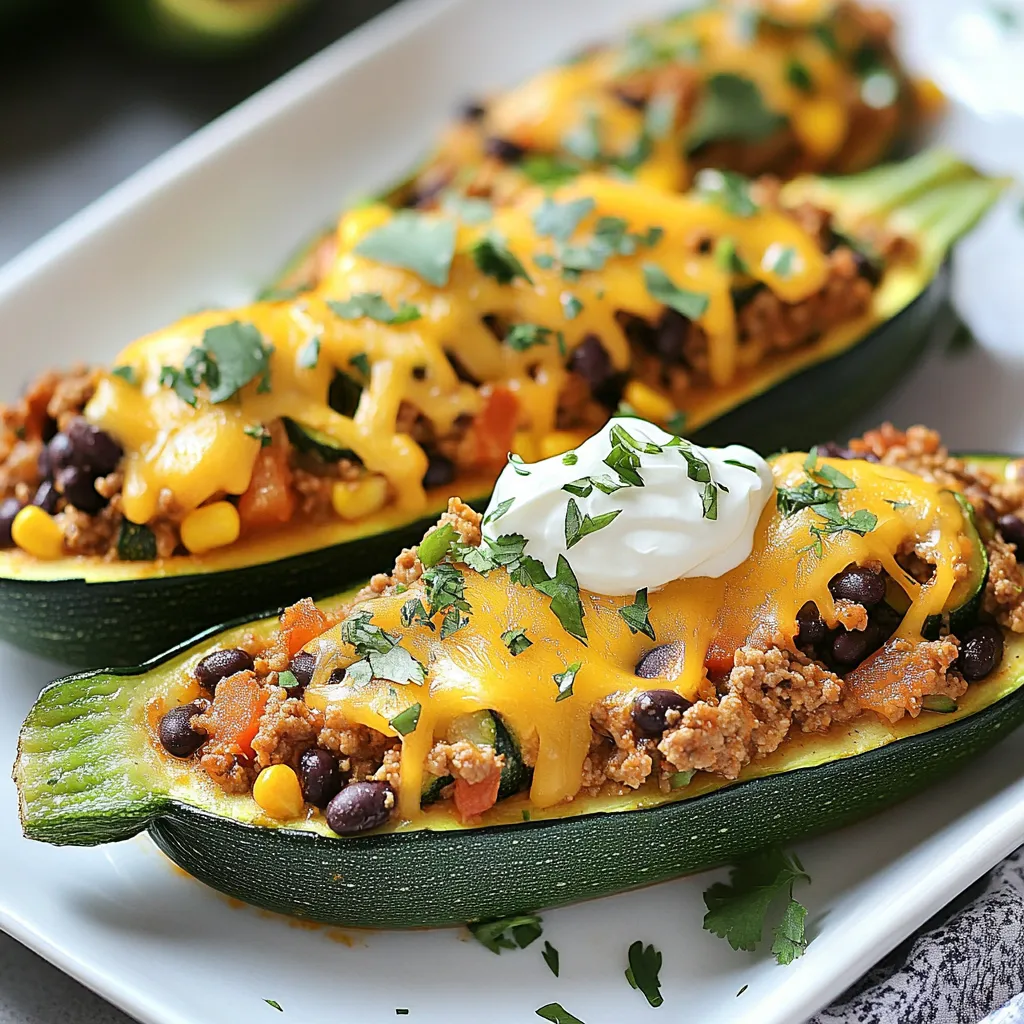 Delicious zucchini boats filled with a cheesy taco mixture, perfect for a healthy meal.
