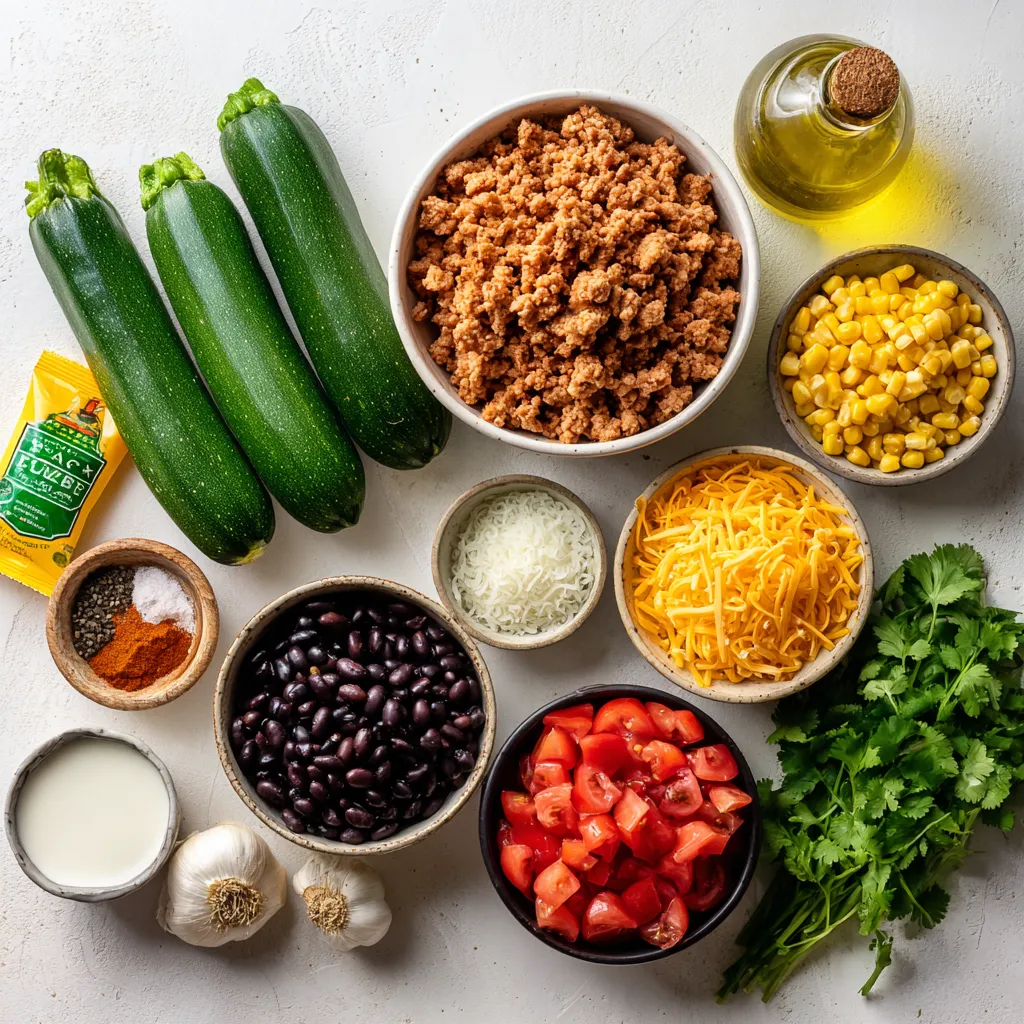 To make Cheesy Taco Stuffed Zucchini, you need a few simple ingredients. Here’s what you’ll need: