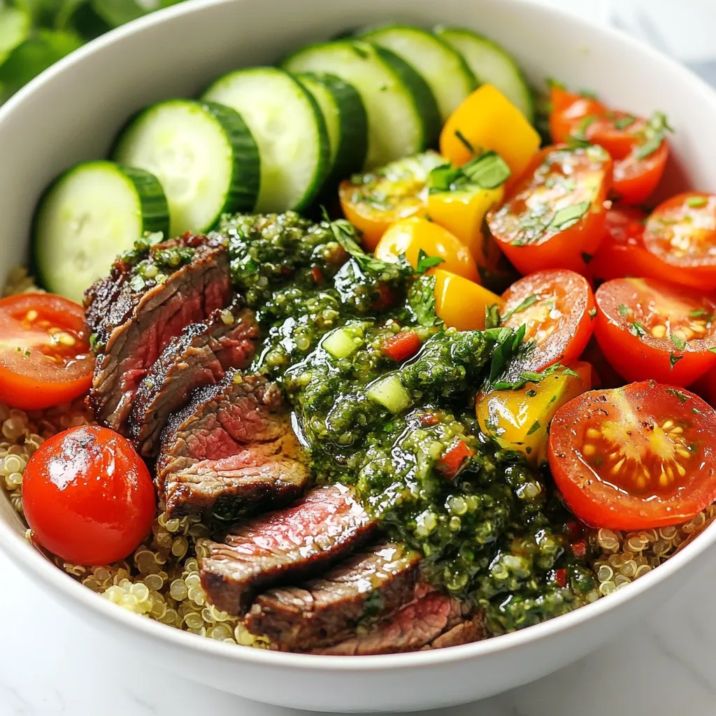 A flavorful bowl featuring marinated flank steak, fresh vegetables, and chimichurri sauce served over quinoa or rice.