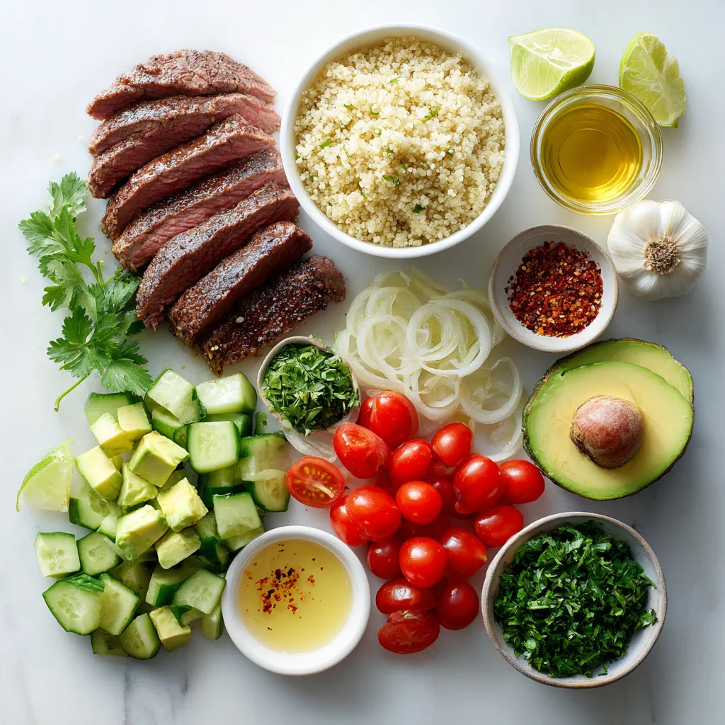 Assemble the Bowl: In a bowl, layer the cooked quinoa or rice as a base. Top with sliced steak, halved cherry tomatoes, diced cucumber, and sliced avocado.