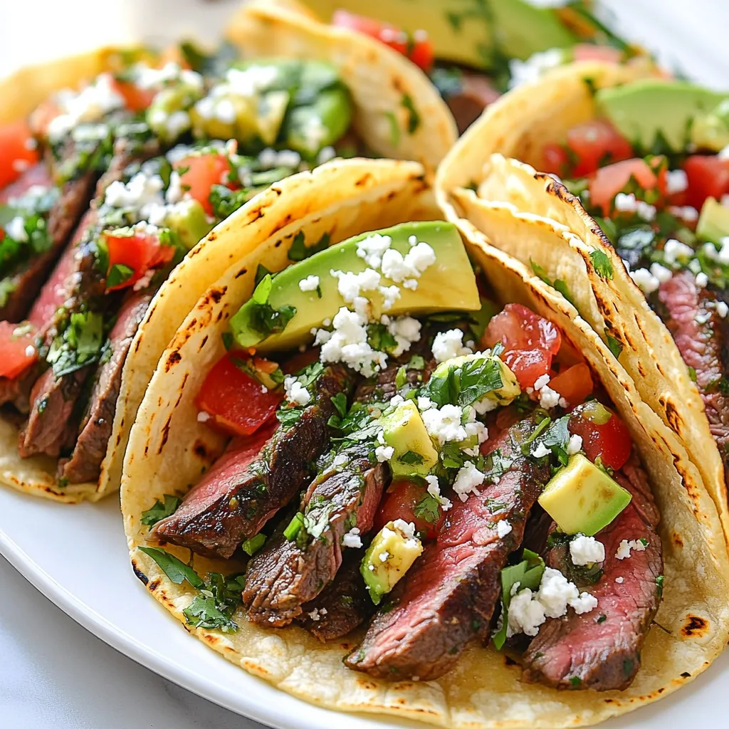 Now it’s time for the tortillas. Heat a dry skillet over medium heat. Warm each corn tortilla for about 30 seconds on each side. This softens them and makes them easier to fold. Once warmed, it’s time to assemble. Take a tortilla and add a few slices of steak in the center. Spoon on some chimichurri sauce. Top with sliced avocado, diced tomatoes, and crumbled queso fresco. Repeat with the remaining tortillas. If you like, garnish with extra cilantro for a fresh touch. Enjoy your tasty tacos right away!