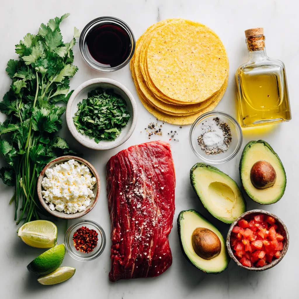 To make Chimichurri steak tacos, you need fresh, quality ingredients. Flank steak gives a rich flavor. It cooks quickly and stays juicy. Corn tortillas add a nice texture. They hold all the tasty fillings well. Fresh herbs like cilantro and parsley brighten the dish. Garlic adds a punch of flavor. Red pepper flakes bring a hint of heat. Red wine vinegar adds tanginess, balancing the steak’s richness.