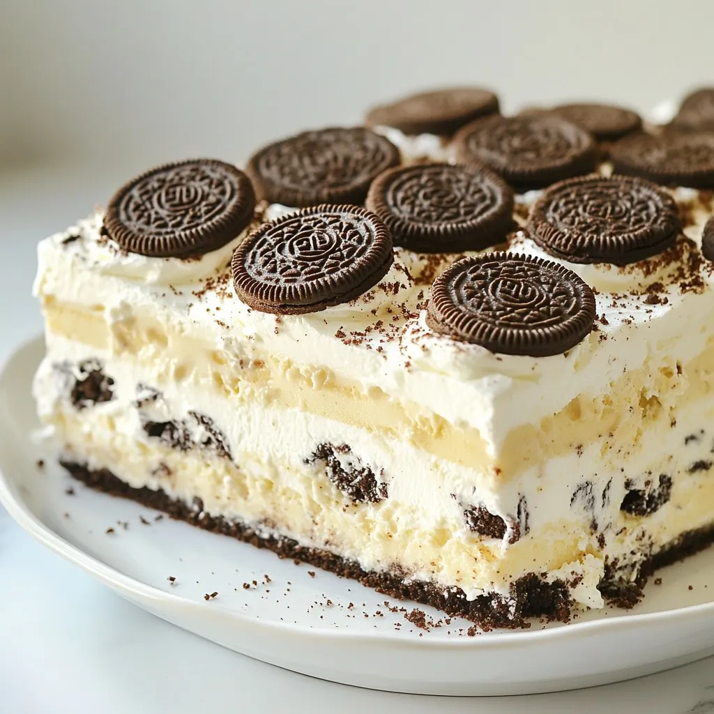 - 2 cups heavy whipping cream - 1/2 cup powdered sugar - 1 teaspoon vanilla extract - 18-20 Oreo cookies, crushed (plus a few extra for garnish) - 1 cup chocolate sandwich cookies, crushed - 1/2 cup cream cheese, softened - 1/4 cup granulated sugar - 1/2 cup milk - Optional: chocolate shavings or sprinkles for garnish To make Cookies and Cream Icebox Cake, gather the ingredients first. You need heavy whipping cream, powdered sugar, and vanilla extract. The Oreo cookies and chocolate sandwich cookies add flavor and texture. Cream cheese gives a nice creaminess, while granulated sugar sweetens the mix. Milk helps blend the cream cheese smoothly. Feel free to use chocolate shavings or sprinkles as optional garnishes. These can add a fun touch to your cake. The ingredients work well together. They create a rich and tasty dessert that is easy to make. When you have all these items, you’re ready to start. This no-bake dessert is perfect for any gathering. It takes little time to prepare but needs some chilling. The longer it sits, the better the flavors meld. Enjoy making this sweet treat! {{ingredient_image_1}} First, grab a large mixing bowl. Pour in the 2 cups of heavy whipping cream. Beat it with an electric mixer on medium speed. Watch it thicken as you mix. After a minute, add 1/2 cup of powdered sugar and 1 teaspoon of vanilla extract. Keep beating until you see stiff peaks form. This might take a few minutes. Once done, set this whipped cream aside. Next, take another bowl. Add 1/2 cup of softened cream cheese and 1/4 cup of granulated sugar. Mix it until it’s smooth and creamy. Now, slowly pour in 1/2 cup of milk. Keep mixing until no lumps are left. This mixture should be nice and creamy. After that, gently fold in one-third of the whipped cream. Mix until it’s well combined. Then, add the rest of the whipped cream, folding it in gently. Layering Cookies Get a 9x13 inch baking dish. Start with the first layer of cookies. Take half of the crushed Oreo cookies and dip them in milk for a few seconds. Place them on the bottom of the dish in a single layer. Spreading the Whipped Cream Mixture Now, spread half of your whipped cream mixture over the cookies. Smooth it out evenly with a spatula. Repeat this process with another layer of dipped cookies. On top of that, spread the remaining whipped cream mixture. To finish, sprinkle the top with the crushed chocolate sandwich cookies and any extra Oreo pieces. Cover your dish with plastic wrap. Refrigerate it for at least 4 hours, or better yet, overnight. This allows all the flavors to blend perfectly. To get stiff peaks in your whipped cream, start with cold tools. Use a chilled bowl and beaters. Pour 2 cups of heavy whipping cream into the bowl. Beat it on medium speed. When it thickens, add 1/2 cup of powdered sugar and 1 teaspoon of vanilla extract. Keep beating until peaks form. The cream should hold its shape. If it looks runny, keep beating a bit longer. Layering is key for a great icebox cake. Begin with dipped cookies. Take 18-20 Oreo cookies and dip them in milk. Don’t soak them too long or they will fall apart. Place half of the cookies in your dish. Next, spread half of the whipped cream mixture evenly over the cookies. Repeat this with another layer of dipped cookies and the rest of the whipped cream. Finish with crushed chocolate sandwich cookies on top. - Using Chocolate Shavings For a rich touch, add chocolate shavings on top. Use a vegetable peeler on a chocolate bar. Scatter the shavings over the cake before serving. This adds a nice look and taste. - Incorporating Sprinkles For fun and color, sprinkle some colorful sprinkles on top. They make the cake pop and look festive. You can use any sprinkles you like, from classic to themed. Pro Tips Use Cold Ingredients: Make sure your heavy cream and cream cheese are chilled before starting. This helps achieve better whipping and a smoother texture. Don't Overmix: When folding the whipped cream into the cream cheese mixture, be gentle to keep the mixture light and airy. Experiment with Flavors: Feel free to add a splash of mint extract or almond extract for a unique twist on traditional cookies and cream flavor. Chill Longer for Best Results: While 4 hours is sufficient, letting the cake chill overnight allows the flavors to meld beautifully and the texture to set perfectly. {{image_2}} You can change up the flavor of your Cookies and Cream Icebox Cake. Try adding different extracts. Almond or mint extracts can add a unique twist. You can also mix in some cocoa powder for a rich chocolate taste. If you want a fruity flavor, fold in crushed strawberries or raspberries. This can add freshness and color to your cake. You don't have to stick with just Oreos. Try using different cookies for a new taste. Chocolate chip cookies work great too. You can also use graham crackers for a lighter feel. For a fun change, use peanut butter cookies for a nutty flavor. Each cookie brings its own charm to the cake. If you need a gluten-free dessert, there are tasty choices. Look for gluten-free sandwich cookies. Many brands offer this option today. Just make sure to check the labels. You can use gluten-free graham crackers as well. They work well in place of regular cookies. You can make this cake dairy-free too. Use coconut cream instead of heavy cream. It whips up nicely and adds a tropical hint. Replace cream cheese with a dairy-free version, like cashew cream. Use almond or oat milk instead of regular milk for a great taste. These swaps make the cake friendly for everyone. To keep your Cookies and Cream Icebox Cake fresh, store it in the fridge. Use an airtight container or cover the dish tightly with plastic wrap. This helps prevent the cake from absorbing other odors in the fridge. If you want to keep it longer, freezing is also an option. In the fridge, your icebox cake will last about 3 to 5 days. The cake may soften a bit over time, but it will still taste great. Just make sure to ch