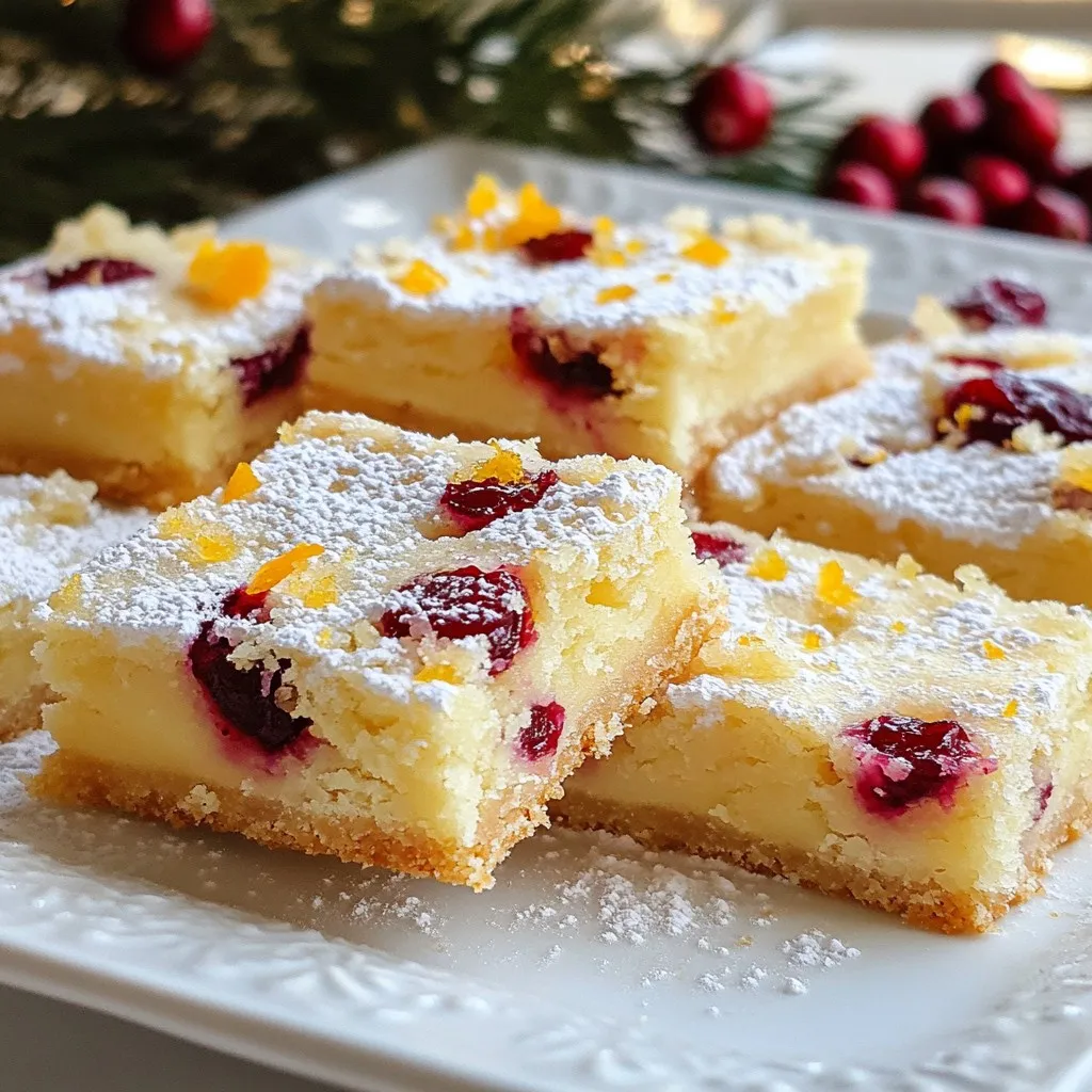 - 1 cup unsalted butter, softened - 1/2 cup powdered sugar - 2 cups all-purpose flour - 1/2 teaspoon salt - 1 cup dried cranberries, chopped - Zest of 1 large orange - 2 tablespoons fresh orange juice - 1 teaspoon vanilla extract - 1/4 teaspoon almond extract (optional) - Powdered sugar for dusting Unsalted butter works best for these bars. It gives you control over salt levels. You can swap unsalted butter for salted butter if needed. Just skip the added salt. For dried cranberries, look for good quality ones. You can also use other dried fruits if you prefer. Chopped nuts can add a nice crunch, too. Almond extract is optional but adds a nice touch. Fresh orange zest and juice are key. They bring bright, bold flavors to the bars. Zest adds oils that create a strong orange flavor. Fresh juice balances the sweetness with a bit of tartness. Using fresh ingredients will make your shortbread bars taste much better. Always choose ripe oranges for the zest and juice. {{ingredient_image_1}} Start by gathering your ingredients. You will need: - 1 cup unsalted butter, softened - 1/2 cup powdered sugar - 2 cups all-purpose flour - 1/2 teaspoon salt - 1 cup dried cranberries, chopped - Zest of 1 large orange - 2 tablespoons fresh orange juice - 1 teaspoon vanilla extract - 1/4 teaspoon almond extract (optional) - Powdered sugar for dusting First, preheat your oven to 350°F (175°C). Grease a 9x9-inch baking pan or line it with parchment paper. This helps with easy removal later. In a large bowl, cream the softened butter and powdered sugar. Use an electric mixer on medium speed for about 3-4 minutes. The mixture should look light and fluffy. Next, gradually add the flour and salt. Mix on low speed until combined. You want a crumbly dough. Now, stir in the chopped cranberries, orange zest, orange juice, and vanilla extract. If you like, add the almond extract for more depth. Make sure everything blends well into the dough. Press the dough evenly into your prepared baking pan. Use a spatula or your fingers to smooth the top. Now it's time to bake! Place the pan in your preheated oven. Bake for 25-30 minutes. You know they are done when the edges turn lightly golden. A toothpick inserted in the center should come out clean. Once baked, remove the bars from the oven. Let them cool in the pan for about 10 minutes. If you used parchment paper, lift the bars out. Place them on a wire rack to cool completely. After cooling, slice into bars. Dust the tops lightly with powdered sugar. This adds a sweet touch. Serve them on a decorative platter. You can garnish with fresh cranberries and orange slices for a festive look. Enjoy your lovely cranberry orange shortbread bars! To get the right texture in your bars, start with soft butter. Cream the butter and sugar well. This step adds air and makes the bars light. Mix until fluffy for about three to four minutes. When you add the flour, mix slowly. Overmixing can make the bars tough. Your dough should be crumbly but hold together when pressed. One common mistake is not measuring ingredients accurately. Use dry measuring cups for flour and sugar. Another mistake is skipping the cooling step. Let the bars cool in the pan for ten minutes. This helps them firm up before cutting. Finally, avoid baking too long. Check for golden edges and a clean toothpick for doneness. For a great finish, wait until the bars are cool. Use a fine mesh sieve to dust the sugar. This gives an even coat without clumps. If you want a fun twist, mix in a bit of orange zest with the sugar. This adds flavor and makes the bars even more festive. Enjoy the bright touch of sweetness! Pro Tips Chill the Dough: For a firmer dough that’s easier to press into the pan, chill it in the refrigerator for 30 minutes before baking. Use Fresh Ingredients: Freshly squeezed orange juice and freshly grated zest will give your bars a more vibrant flavor compared to bottled alternatives. Don't Overbake: Keep an eye on the bars while baking; they should be lightly golden on the edges but still soft in the center for the best texture. Store Properly: Keep the bars in an airtight container at room temperature for up to a week, or refrigerate for longer freshness. {{image_2}} You can switch up the flavors in your cranberry orange shortbread bars! Try adding nuts like walnuts or almonds. They add a nice crunch and flavor. You can also mix in chocolate chips. Dark chocolate pairs well with orange and cranberry. It adds a rich taste that many will love. You can make these bars gluten-free by using a gluten-free flour blend. Just make sure it works well in baking. For a vegan version, swap the butter for coconut oil or vegan butter. Use a powdered sugar that is free from animal products. You can also skip the eggs since this recipe does not need them. Feel free to change the fruits based on the season. In the summer, use fresh blueberries or raspberries. They add a burst of flavor and color. In the fall, try using diced apples with cinnamon. This will give your bars a warm, cozy taste. Each fruit brings its own charm to the bars, making them special for every occasion. To keep your cranberry orange shortbread bars fresh, store them in an airtight container. Line the container with parchment paper to absorb moisture. This helps maintain the bars' crisp texture. If you plan to eat them within a week, store them at room temperature. For longer storage, refrigeration is best. Freezing is a great way to keep these bars for later. First, cut the bars into squares. Wrap each square tightly in plastic wrap. Then, place them in a freezer-safe bag or container. They can last up to three months in the freezer. When you're ready to enjoy them, just thaw them in the fridge overnight. Cranberry orange shortbread bars are best eaten within a week when stored at room temperature. If refrigerated, they may last up to two weeks. To reheat, place a bar in the microwave for 10-15 seconds. This warms it up without losing its texture. Enj