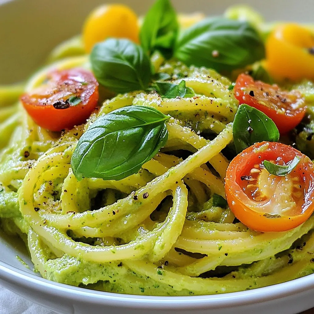 - 2 ripe avocados - 200g pasta (spaghetti or fettuccine) - 1 clove garlic, minced - 2 tablespoons lemon juice - 1/4 cup fresh basil leaves - 1/4 cup grated Parmesan cheese (optional) - 2 tablespoons olive oil - Salt and pepper to taste - Cherry tomatoes, halved (for garnish) To make creamy avocado pasta, gather these fresh ingredients. The ripe avocados give it a rich flavor. The garlic adds a nice kick. Fresh basil brings a pop of color and taste. You can add Parmesan cheese for a savory touch. Olive oil enhances the creaminess. Don't forget to use salt and pepper to taste. Finally, the cherry tomatoes add freshness when serving. When picking avocados, look for ones that feel soft but not mushy. Choose pasta like spaghetti or fettuccine based on your preference. This dish is quick, easy, and tasty. Plus, it’s a great way to enjoy healthy fats. You can get creative by mixing in your favorite flavors. {{ingredient_image_1}} 1. Start by boiling a large pot of salted water. 2. Add 200g of pasta, like spaghetti or fettuccine. 3. Cook the pasta according to the package directions. 4. Before draining, save 1/2 cup of the pasta water. 1. While the pasta cooks, take 2 ripe avocados. 2. Cut them in half, remove the pit, and scoop the flesh into a food processor. 3. Add 1 minced clove of garlic, 2 tablespoons of lemon juice, and 1/4 cup of fresh basil leaves. 4. If you like cheese, add 1/4 cup of grated Parmesan. 5. Pour in 2 tablespoons of olive oil. 6. Blend until the mixture is smooth and creamy. 7. If the sauce is thick, mix in a bit of the reserved pasta water. 1. Once the pasta is cooked and drained, put it back in the pot over low heat. 2. Pour the avocado sauce over the pasta. 3. Toss gently to coat all the pasta well. 4. Add salt and pepper to taste. 5. If you want it creamier, stir in more reserved pasta water. 6. Serve hot, garnished with halved cherry tomatoes and extra basil. To get that smooth and creamy texture, the key is pasta water. Always reserve about 1/2 cup of the water after cooking your pasta. This water has starch, which helps the sauce cling to the pasta. If your avocado sauce is too thick, add a bit of this starchy water. Blend the sauce until it’s silky smooth. If you use a food processor, make sure to scrape down the sides often. This way, you get an even creaminess throughout. Want to make your dish pop? Try adding herbs like parsley or dill. They give a fresh taste. You can also add chili flakes for a bit of heat. If you want cheese but need a change, go for feta or nutritional yeast for a vegan option. These will add a nice bit of saltiness and depth to your pasta. Preparation is key for a great meal. You can cut your avocados and herbs in advance. Just keep them in airtight containers. This way, they stay fresh. When you’re ready to enjoy your pasta, just blend the sauce and heat your pasta. To keep the creaminess, reheat it on low heat. Add a little reserved pasta water if it seems dry. This keeps your dish just as good as when you first made it. Pro Tips Choose Ripe Avocados: For the creamiest sauce, ensure your avocados are perfectly ripe. They should yield slightly to gentle pressure when squeezed. Customize the Pasta Type: While spaghetti and fettuccine work well, feel free to experiment with your favorite pasta shapes to add a personal touch. Add Protein: To make this dish more filling, consider adding grilled chicken, shrimp, or chickpeas for a protein boost. Fresh Herbs Matter: Using fresh basil makes a significant difference in flavor. Consider adding other herbs like parsley or cilantro for a unique twist. {{image_2}} You can make this dish even better by adding protein. - Grilled chicken or shrimp: Cook them on the grill for a nice touch. Slice them thinly and mix in with the pasta. - Plant-based protein options: Try chickpeas or tofu for a vegan option. They add texture and nutrients. If you have diet needs, you have options. - Gluten-free pasta options: Use rice or quinoa pasta. They cook well and taste great. - Vegan substitutes for cheese: Nutritional yeast works well in place of cheese. It gives a cheesy flavor without dairy. You can change this dish with seasonal ingredients. - Adding sautéed vegetables: Bell peppers, spinach, or zucchini can add nice colors and flavors. Just sauté them lightly before mixing. - Using seasonal herbs for different flavors: Try thyme or cilantro for a fresh twist. They can change the taste and make it fun. To store leftover creamy avocado pasta, place it in an airtight container. Make sure it is sealed tightly to keep air out. This helps prevent browning and keeps the pasta fresh. I recommend using glass containers or BPA-free plastic ones. They are safe and keep food well. The best way to reheat creamy avocado pasta is on the stove. Warm it over low heat, stirring gently. You can add a splash of olive oil or a bit of water to keep it creamy. Avoid microwaving, as it can make the pasta dry and change the texture. You can freeze creamy avocado pasta, but it may change in texture. If you want to freeze it, store it in a freezer-safe container. Leave some space for expansion. Thaw it overnight in the fridge when you’re ready to eat. Reheat slowly on the stove for the best results. Creamy avocado pasta stays fresh for about 2 days in the fridge. Store it in an airtight container. The sauce may darken due to oxidation, but it is still safe to eat. If you notice any strange smells or textures, it’s best to toss it. Yes, you can use any pasta you like. Spaghetti or fettuccine works great, but you can try penne, farfalle, or even gluten-free pasta. Just follow the cooking times on the package for best results. Yes, this dish can easily fit a vegan diet. Skip the Parmesan cheese, and use a vegan alternative or nutritional yeast for a cheesy flavor. The rest of the ingredients are naturally vegan-friendly. Absolutely! To add some heat, try adding red pepper flakes or diced jalapeños. You can also toss in some hot s