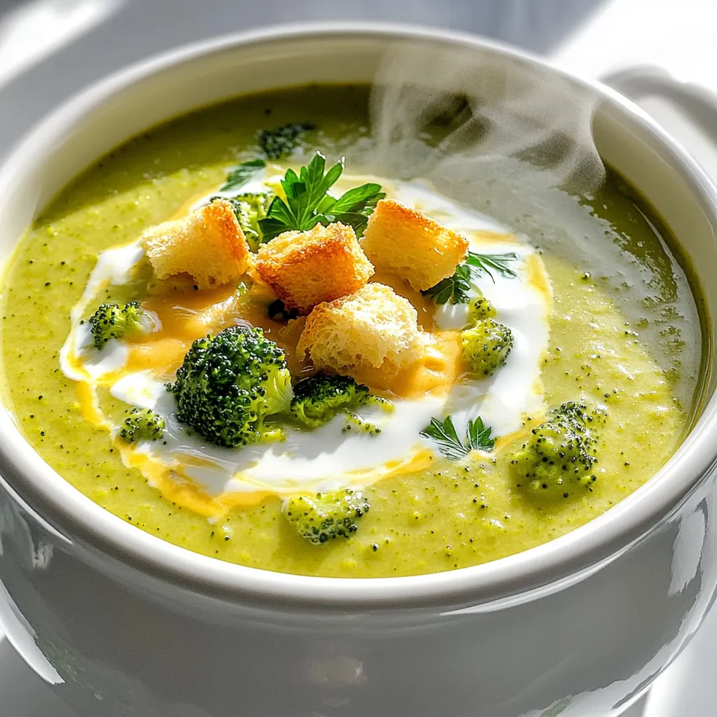 Serve your creamy broccoli cheddar soup with crusty bread. A warm baguette or sourdough works great. You can also add croutons for extra crunch. Fresh parsley adds color and freshness. For a fun touch, serve it in a bread bowl!