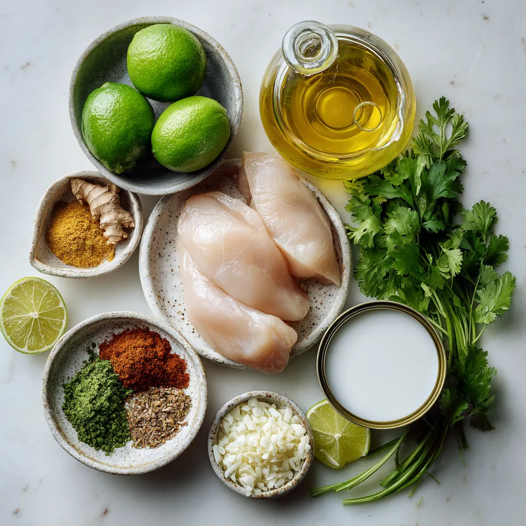 - 4 boneless, skinless chicken breasts - 1 can (13.5 oz) coconut milk - 2 tablespoons olive oil - 3 cloves garlic, minced - 1 small onion, finely chopped - Zest and juice of 2 limes - 1 teaspoon ginger, grated - 1 teaspoon ground cumin - 1 teaspoon paprika - Salt and pepper to taste Creamy Coconut Lime Chicken starts with fresh chicken breasts. They give the dish its main protein. The coconut milk adds creaminess and a rich flavor. I love using fresh garlic and onion for strong taste. Lime juice and zest bring a bright, zesty kick. Ginger adds warmth and depth. Cumin and paprika round out the spices, giving a warm, earthy note. - Salt and pepper to taste Salt and pepper are vital for enhancing flavors. I recommend using fresh ground pepper for a punch. This simple seasoning can elevate the dish. - Fresh cilantro, chopped (for garnish) - Lime wedges (for serving) Cilantro adds a fresh touch and bright color. Lime wedges let you add more zest when serving. I often serve this dish over fluffy jasmine rice. This helps soak up the creamy sauce. {{ingredient_image_1}} Start by patting the chicken breasts dry. This helps the chicken sear better. Next, season both sides with salt and pepper. This simple step boosts the flavor. Now, heat olive oil in a large skillet over medium heat. Add the finely chopped onion and minced garlic. Sauté them for about 3-4 minutes. You want them to become soft and clear. Turn up the heat to medium-high. Add the seasoned chicken breasts to the skillet. Sear each side for about 5-6 minutes. Look for a golden-brown color. This adds a nice crust and flavor. Once browned, we will keep cooking. Lower the heat back to medium. Stir in the grated ginger, ground cumin, and paprika. Cook for one minute. This brings out the spice flavors. Now, pour in the coconut milk, lime zest, and lime juice. Bring this to a gentle simmer. Cover the skillet and let it simmer for about 10-15 minutes. Check that the chicken reaches an internal temperature of 165°F or 75°C. After that, remove the chicken. Let the sauce cook uncovered for about 5 minutes. This helps thicken the sauce. Finally, return the chicken to the skillet and coat it with the creamy sauce. Enjoy your flavorful dish! To get the best flavor from your creamy coconut lime chicken, use fresh ingredients. Fresh garlic and limes make a big difference. I also recommend using full-fat coconut milk. It gives a richer taste and creamier texture. Don't rush the cooking process. Let the spices bloom by cooking them a bit longer. This way, they release their full flavor. One common mistake is not seasoning the chicken well. Always add salt and pepper on both sides. Another mistake is cooking the chicken at too high heat. This can make it tough. Aim for medium-high heat when you sear the chicken. Lastly, don’t skip the simmering step. It helps the chicken soak up all the delicious flavors. To keep your chicken tender, start with even-sized breasts. If some parts are thicker, they will cook unevenly. I suggest pounding them slightly to make them uniform. Always cook the chicken until it reaches 165°F (75°C). Use a meat thermometer for accuracy. Lastly, let the chicken rest for a few minutes after cooking. This helps keep the juices inside, making each bite juicy and flavorful. Pro Tips Marinate for Extra Flavor: For a more intense flavor, consider marinating the chicken in the coconut milk, lime juice, and spices for at least 30 minutes before cooking. Adjust Coconut Milk Consistency: If you prefer a thicker sauce, let it simmer for a bit longer until it reduces to your desired consistency. Enhance with Vegetables: Add bell peppers or snap peas to the skillet during the last 5 minutes of cooking for a pop of color and added nutrition. Serving Suggestions: This dish pairs beautifully with jasmine rice, quinoa, or cauliflower rice for a low-carb option. {{image_2}} For a dairy-free version, this recipe is already perfect. Coconut milk is naturally dairy-free. To make it gluten-free, ensure your spices are gluten-free. Most spices are safe, but check labels to be sure. You could also use gluten-free soy sauce instead of regular soy sauce if you want an umami boost. If you like heat, add some chili flakes or fresh jalapeños. Start with a small amount and taste as you go. You can also use cayenne pepper for a different kick. If you want less spice, skip the chili flakes and use sweet paprika instead of regular paprika. This keeps the dish flavorful without the heat. Serve this dish over jasmine rice for a classic pairing. You can also try quinoa or cauliflower rice for a healthier option. Another fun idea is to serve it with warm naan bread. The sauce is perfect for dipping or scooping. Add a side of steamed vegetables for a balanced meal. This dish is versatile, so feel free to get creative! After enjoying your creamy coconut lime chicken, store leftovers in the fridge. Use an airtight container. Make sure the chicken is cool before sealing. It stays fresh for 3 to 4 days. This dish also tastes great the next day. To reheat, place your chicken in a skillet over low heat. Add a splash of coconut milk to keep it moist. Stir gently until heated through. You can also use a microwave. Heat in short bursts, checking often to avoid drying it out. You can freeze creamy coconut lime chicken for later meals. Use a freezer-safe container. It can last up to 2 months. When ready to eat, thaw in the fridge overnight. Reheat gently to keep the flavors intact. If you need a substitute for coconut milk, use almond milk or soy milk. You can also mix 1 part cream with 1 part water. Each option offers a different flavor. Use these carefully to keep the dish tasty. To add heat, use red pepper flakes or diced jalapeños. Stir them into the sauce early for more kick. You can also add a dash of hot sauce when serving. Adjust to your preferred spice level for the best taste. Yes, chicken thighs work great in this dish. They stay juicy and tender while cookin