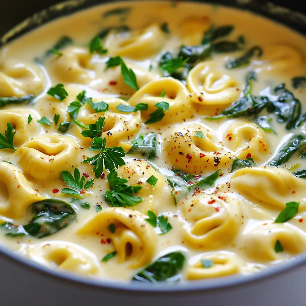 - 10 oz cheese tortellini (fresh or frozen) - 2 tablespoons olive oil - 3 cloves garlic, minced - 4 cups fresh spinach, packed - 1 cup heavy cream - 1 cup vegetable broth - 1 cup grated Parmesan cheese - 1 teaspoon garlic powder - 1/2 teaspoon nutmeg - Salt and pepper to taste - Fresh parsley, chopped (for garnish) - Optional: Red pepper flakes for heat To make this creamy dish, you will need: - A large pot or Dutch oven - A cutting board and knife - A wooden spoon or spatula - Measuring cups and spoons Using good quality ingredients makes a big difference. Fresh spinach tastes bright and adds color. Choose a cheese tortellini that you love. Fresh tortellini can be softer and more flavorful. For the cream, use heavy cream for the best richness. Freshly grated Parmesan cheese melts better than pre-grated cheese. If you like spice, keep red pepper flakes on hand. This will add a nice kick if you want it. 1. Gather your ingredients first. You need cheese tortellini, spinach, and garlic. 2. Chop the garlic finely. Fresh garlic gives the best flavor. 3. Wash the spinach leaves. Make sure to remove any dirt. 4. Measure out the heavy cream and vegetable broth. 5. Grate your Parmesan cheese if not pre-grated. 1. Heat the olive oil in a large pot over medium heat. Look for a shimmering surface. 2. Add the minced garlic and stir for about one minute. You want it fragrant, not burnt. 3. Toss in the fresh spinach. Cook it until it wilts, which takes about 2-3 minutes. 4. Pour in the heavy cream and vegetable broth. Stir to mix everything well. 5. Bring the mix to a gentle simmer, which is when small bubbles form. 6. Add the tortellini, garlic powder, nutmeg, salt, and pepper. Stir until combined. 7. Cover the pot and cook for 5-7 minutes. Stir occasionally so it cooks evenly. 8. Check if the tortellini is tender and the sauce thickens. 9. Remove the pot from heat. Stir in the grated Parmesan until it melts. 10. If you like spice, sprinkle some red pepper flakes on top. 11. Serve the dish hot, and garnish with fresh parsley. - Set a timer for 5 minutes once you cover the pot. - Stir the tortellini every couple of minutes to prevent sticking. - Taste a piece to check for doneness; it should be soft but not mushy. - If the sauce seems too thick, add a splash more broth or cream. - Keep an eye on the heat; adjust it if the sauce simmers too hard. To make a creamy sauce, start with fresh ingredients. Using heavy cream gives the best texture. Cook garlic until it smells good, but don’t let it burn. The spinach should wilt but stay bright green. Stir in the cream and broth slowly for the best mix. When you add Parmesan, do it off the heat to keep it smooth. Want to boost the flavor? Add a pinch of nutmeg; it really wakes up the creaminess. If you like heat, sprinkle in some red pepper flakes. Fresh parsley on top adds color and flavor. You can also toss in more garlic powder for a richer taste. Each of these small changes makes a big difference. Don’t rush the garlic; let it cook gently. If you burn it, the sauce will taste bitter. Avoid overcooking the tortellini; it can turn mushy. Check the seasoning before serving; a little extra salt can bring out all the flavors. Lastly, don’t skip the garnish; it makes your dish pop and look inviting. {{image_2}} You can easily boost this dish by adding protein. Cooked chicken or shrimp works well here. Simply sauté your meat in the pot before adding the garlic. This adds flavor and makes the meal heartier. If using chicken, I recommend diced grilled chicken for best results. For shrimp, add them when the tortellini cooks. They only need a few minutes to get juicy and tender. Feel free to mix in other veggies for added nutrition. Broccoli, peas, or bell peppers add great color and taste. You can also use frozen spinach if fresh isn’t available. Just make sure to thaw and drain it first. Adding different vegetables keeps the dish fun and healthy. Try combining a few for extra flavor! Switching up the sauce or cheese can change the whole dish. Instead of heavy cream, you could use a light cream or even a dairy-free option. For cheese, try mozzarella for a milder taste or goat cheese for a tangy twist. You can also add Alfredo sauce for extra creaminess. Don’t be afraid to get creative! To keep your creamy one-pot spinach Alfredo tortellini fresh, store it in an airtight container. I recommend refrigerating it within two hours of cooking. It will stay good for about three to four days. If you have more leftovers, you can place them in smaller portions. This makes it easy to grab a quick meal later. When you're ready to enjoy your leftovers, heat them gently. You can use the microwave or a saucepan. If using the microwave, warm it in short bursts. Stir in between to ensure even heating. If you use a saucepan, add a splash of vegetable broth or cream. This helps bring back the creamy texture. If you want to freeze your tortellini, do it before adding the cheese. Place it in a freezer-safe container or bag. It will keep for up to two months. When you’re ready to eat it, thaw it in the fridge overnight. Then, heat it up in a pot, adding cream and cheese to restore the sauce's creaminess. Enjoy! Yes, you can use frozen tortellini. It works well in this recipe. Just add it directly to the pot without thawing. The cooking time may be a minute longer, so keep an eye on it. The frozen tortellini will still soak up all the creamy flavor. To make this dish lighter, you can use half-and-half instead of heavy cream. You can also replace some of the cheese with a low-fat version. Adding more spinach and other veggies can help too. This keeps the taste great while cutting down on calories. You can use a mix of milk and yogurt as a substitute for heavy cream. This blend gives you creaminess with fewer calories. Another option is to use coconut milk for a dairy-free twist. Each choice will change the flavor a bit, but it will still taste good. Yes, you can make this dish a