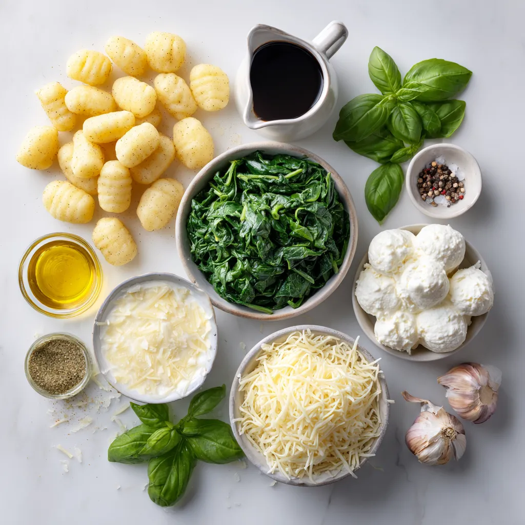 To make this creamy spinach gnocchi bake, gather these simple ingredients: