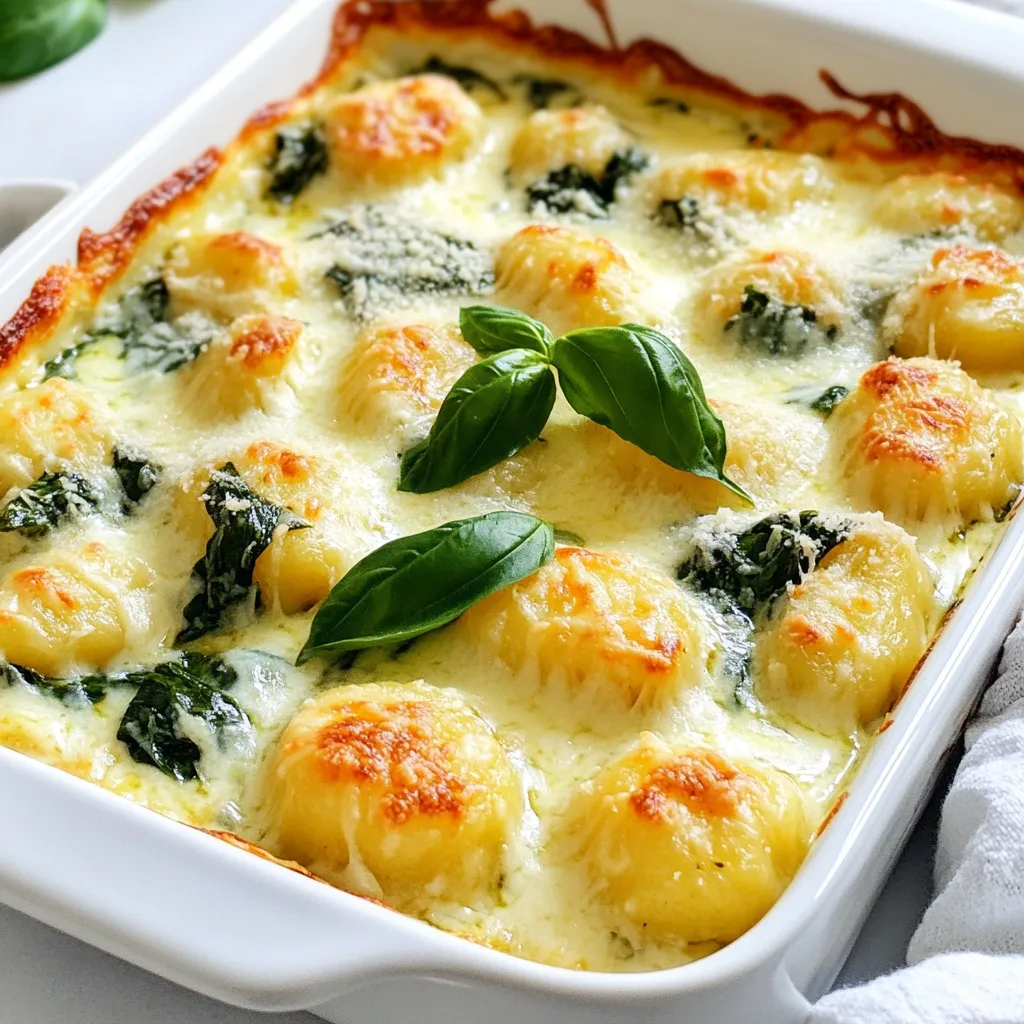 A delicious and creamy baked dish featuring potato gnocchi, fresh spinach, and a blend of cheeses.