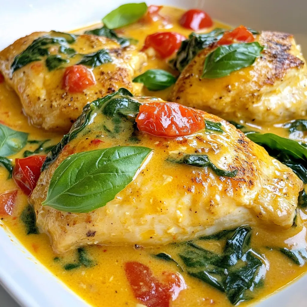 A delicious and creamy chicken dish with tomatoes and spinach, perfect for a comforting meal.
