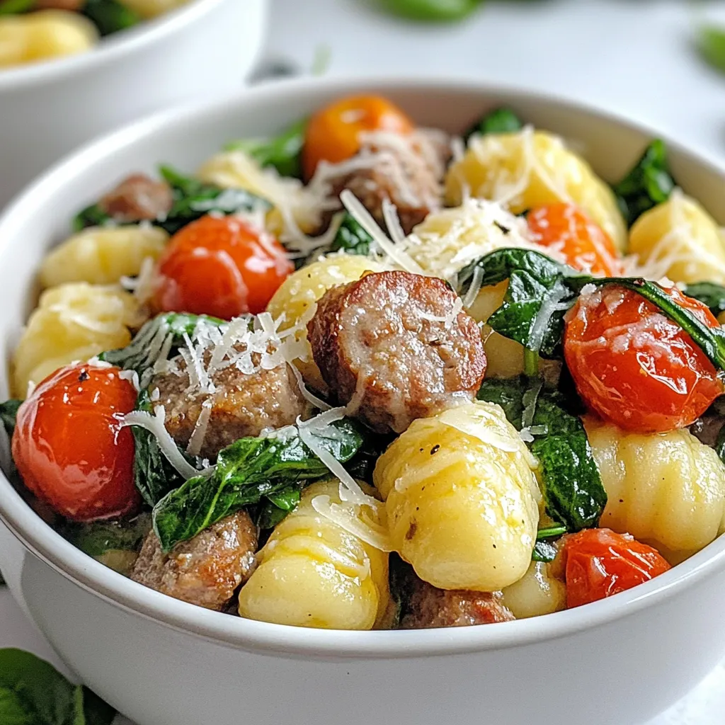 A delicious and creamy dish featuring gnocchi, Italian sausage, and fresh vegetables.