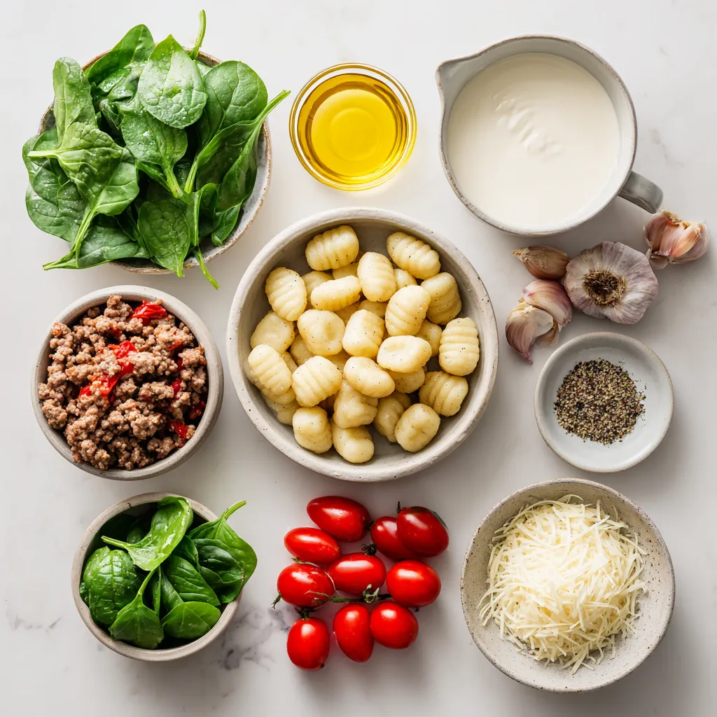 For this creamy Tuscan sausage gnocchi, start with the main ingredients. The potato gnocchi is the star. It is soft and pillowy, making it a perfect match for the rich sauce. Use a pound for a hearty meal. The Italian sausage adds flavor. You can choose spicy or mild based on your taste. Use one pound for the best results.