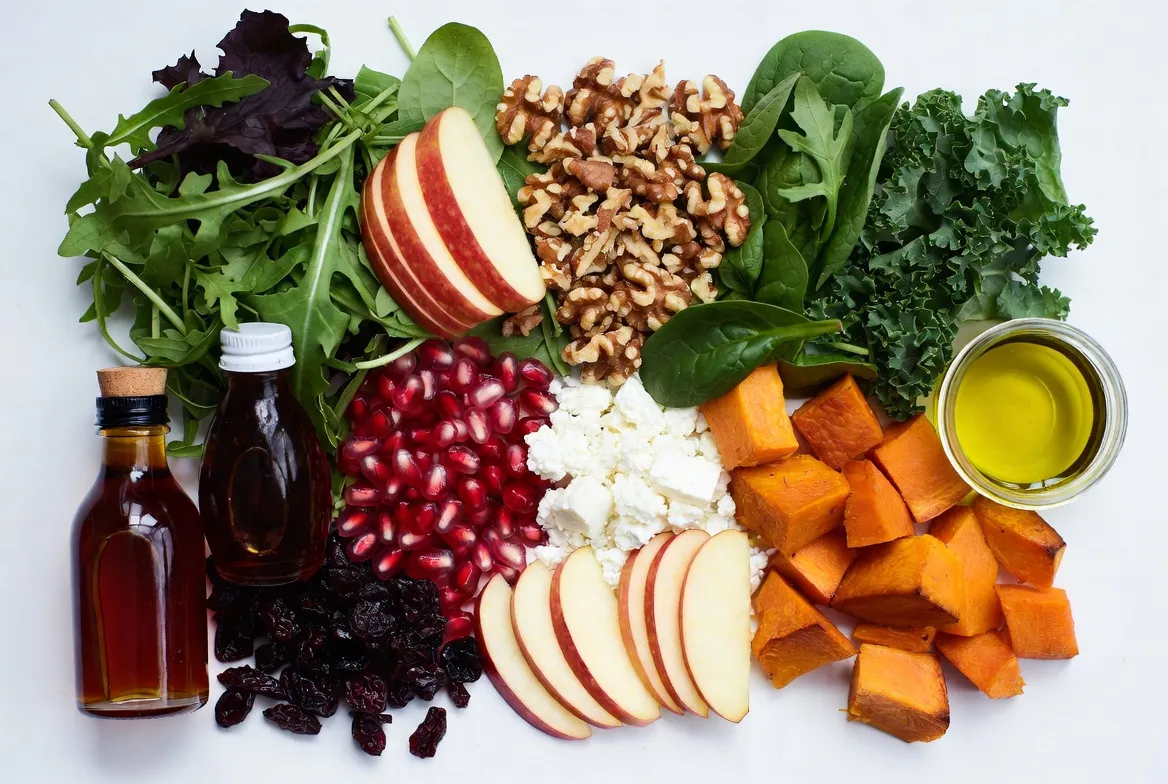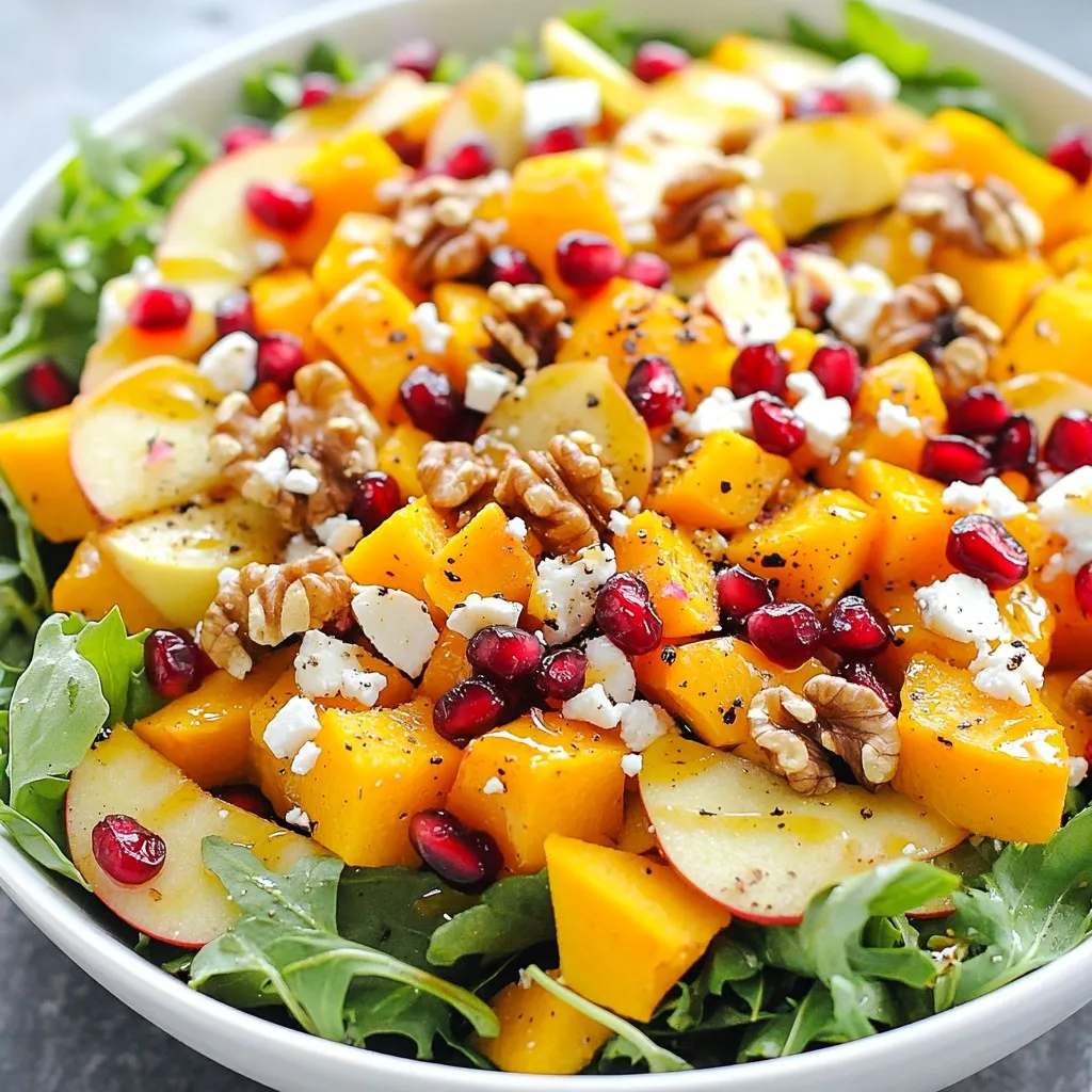 A vibrant salad featuring seasonal ingredients like mixed greens, apple, roasted butternut squash, and pomegranate seeds, dressed with a sweet and tangy vinaigrette.