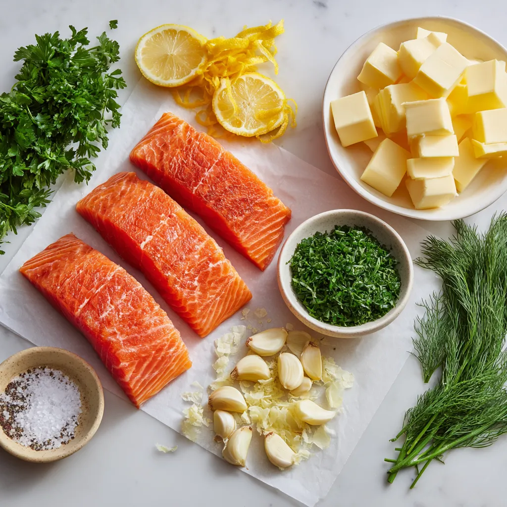 Gather these fresh ingredients before you start cooking. The salmon fillets are the star of the dish. They need to be fresh for the best flavor. Unsalted butter adds richness and helps the garlic infuse its aroma. Minced garlic gives this dish its bold taste.