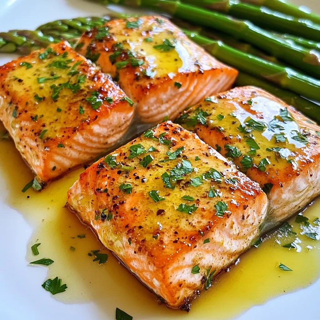 A delicious and healthy dish featuring salmon fillets and asparagus, coated in garlic butter.