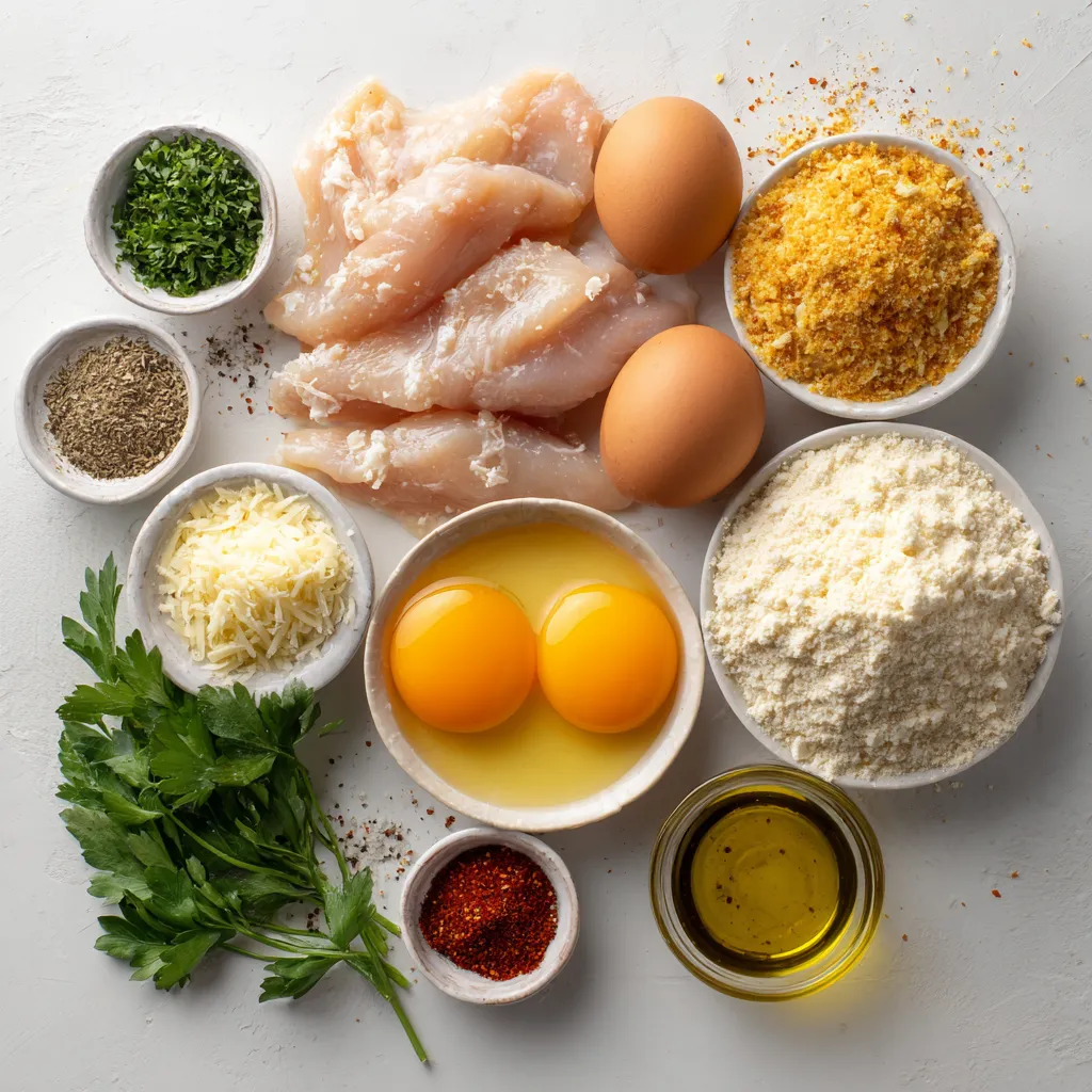 Start by gathering your bowls. You need three. In the first bowl, add one cup of all-purpose flour. This flour gives your tenders a nice base. In the second bowl, crack two large eggs. Whisk them until they blend well. In the last bowl, mix one cup of breadcrumbs with one cup of grated Parmesan cheese. Add four minced garlic cloves, one teaspoon of dried oregano, one teaspoon of paprika, and salt and pepper. This mix will give your chicken a yummy flavor.