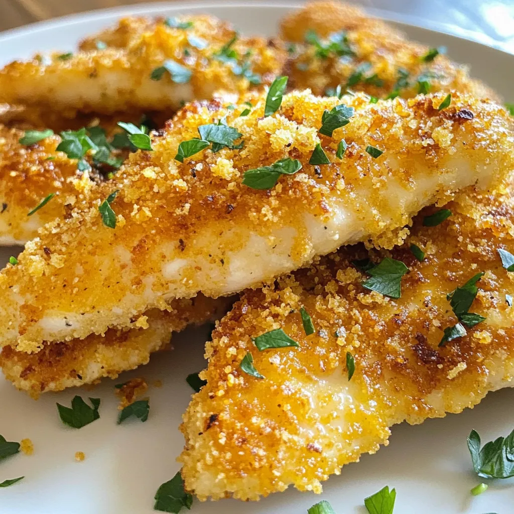 To make Garlic Parmesan Chicken Tenders, gather these ingredients: - 1 pound chicken tenders - 1 cup all-purpose flour - 2 large eggs - 1 cup breadcrumbs (panko works best) - 1 cup grated Parmesan cheese - 4 cloves garlic, minced - 1 teaspoon dried oregano - 1 teaspoon paprika - Salt and pepper to taste - 1/4 cup fresh parsley, chopped (for garnish) - 1/4 cup olive oil (for frying) You can swap ingredients based on what you have: - For gluten-free, use gluten-free flour and breadcrumbs. - Try other cheeses like mozzarella or cheddar if you prefer. - If you don't have fresh garlic, use garlic powder (1/2 teaspoon). - Instead of parsley, use basil or cilantro for a different flavor. Having the right tools makes cooking easier: - Three mixing bowls for the breading station. - A large skillet for frying the chicken. - Tongs for flipping the tenders. - A paper towel-lined plate to drain excess oil. - A whisk for beating the eggs. These tools help you make crispy, tasty chicken tenders with ease. Enjoy the process! {{ingredient_image_1}} Start by gathering your bowls. You need three. In the first bowl, add one cup of all-purpose flour. This flour gives your tenders a nice base. In the second bowl, crack two large eggs. Whisk them until they blend well. In the last bowl, mix one cup of breadcrumbs with one cup of grated Parmesan cheese. Add four minced garlic cloves, one teaspoon of dried oregano, one teaspoon of paprika, and salt and pepper. This mix will give your chicken a yummy flavor. Take one pound of chicken tenders and pat them dry with a paper towel. This helps the coating stick better. Lightly season the tenders with salt and pepper. Now, it’s time to coat them. First, dredge each tender in the flour. Shake off any extra flour. Next, dip it in the egg mix, making sure it’s fully coated. Finally, place it in the breadcrumb mixture. Press down gently to help the crumbs stick. Heat a large skillet over medium heat. Add one-fourth cup of olive oil. Wait until the oil is hot but not smoking. This step is key for crispy tenders. Add the breaded chicken tenders in batches. Be careful not to crowd the pan. Cook each side for about 4-5 minutes. You want them golden brown and cooked through. When done, use tongs to remove the tenders from the skillet. Place them on a paper towel-lined plate to soak up extra oil. Serve warm and garnish with chopped fresh parsley for a bright touch. To make your chicken tenders extra crunchy, use panko breadcrumbs. Panko is lighter and flakier than regular breadcrumbs. This gives you a crispier texture. You can also double coat your tenders. First, coat them in flour, dip in egg, and then coat again in breadcrumbs. This adds even more crunch! You can change the flavor of your chicken tenders easily. Try adding lemon zest for a bright taste. A pinch of cayenne pepper gives a spicy kick. You can also mix in different herbs. Basil or thyme would work well. Experiment to find your favorite! Always wash your hands before and after handling raw chicken. Use separate cutting boards for raw meat and veggies. This prevents cross-contamination. Make sure the chicken reaches an internal temperature of 165°F. Use a meat thermometer to check this. Finally, let the oil heat before adding the chicken. This helps it cook evenly and keeps it crispy. Pro Tips Tip Title: Use Panko Breadcrumbs: Panko breadcrumbs provide an extra crunch that regular breadcrumbs can’t match, making your chicken tenders even more delicious. Tip Title: Season Each Layer: Don’t skip seasoning the flour and egg mixture. This adds depth to the flavor of the chicken tenders at every layer of breading. Tip Title: Maintain Oil Temperature: Ensure the oil is hot enough before adding the chicken. If it’s not hot enough, the tenders will absorb too much oil and become greasy. Tip Title: Let Rest After Cooking: Allow the chicken tenders to rest on a paper towel-lined plate for a few minutes after frying. This helps to keep them crispy and reduces excess oil. {{image_2}} You can make a healthier version of garlic Parmesan chicken tenders by baking them. To do this, follow the same steps for breading the chicken. Instead of frying, place the chicken on a baking sheet lined with parchment paper. Spray the tenders lightly with olive oil. Bake in a preheated oven at 400°F (200°C) for about 20 minutes. This method gives you crunchy tenders with less oil. If you like heat, add spice to your chicken tenders. Mix in some cayenne pepper or crushed red pepper flakes with the breadcrumb mixture. You can also add a dash of hot sauce to the egg mixture. This variation brings a nice kick and pairs well with the garlic and Parmesan flavors. For a gluten-free option, swap the all-purpose flour and breadcrumbs. Use a gluten-free flour blend instead. For the breadcrumbs, try crushed gluten-free crackers or panko. The taste will still be amazing, and you won’t miss the gluten at all. Just follow the same steps as before, and you’ll have delicious gluten-free garlic Parmesan chicken tenders. To keep your garlic Parmesan chicken tenders fresh, place them in an airtight container. Let them cool to room temperature first. Then, store them in the fridge. They will stay good for about 3 to 4 days. Make sure to label the container with the date you made them. This way, you’ll know when to use them. When you're ready to enjoy your leftovers, reheating them right is key. Preheat your oven to 375°F (190°C). Place the chicken tenders on a baking sheet. Bake them for about 10 to 15 minutes. This will make them crispy again. If you’re in a hurry, you can use the microwave. Heat them on a plate for about 1 to 2 minutes. But, keep in mind they might not be as crispy. If you want to save some chicken tenders for later, freezing is a great option. First, let them cool completely. Then, place them in a freezer-safe bag or container. Try to remove as much air as possible to prevent freezer burn. They can last in the freezer for 