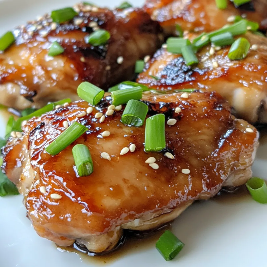 I love gathering fresh ingredients for Ginger Soy Glazed Chicken Thighs. Each one adds a special touch. Here’s what you need: - Chicken - 4 boneless, skinless chicken thighs - Marinade Ingredients - 4 tablespoons soy sauce - 2 tablespoons fresh ginger, grated - 2 tablespoons honey - 2 cloves garlic, minced - 2 tablespoons sesame oil - 1 teaspoon rice vinegar - 1 teaspoon cornstarch (optional, for thickening) - 1 tablespoon water (if using cornstarch) - Garnishes - 2 green onions, chopped - Sesame seeds Each ingredient plays a key role in creating that delicious flavor. The chicken thighs soak up the marinade well, making them juicy and tasty. The ginger and honey balance each other. The soy sauce adds depth. You can even adjust the ingredients to fit your taste! {{ingredient_image_1}} To start, grab a medium bowl. You will whisk together soy sauce, grated ginger, honey, minced garlic, sesame oil, and rice vinegar. This mix will create a flavorful marinade that gives the chicken its tasty glaze. If you want a thicker glaze, you can add cornstarch. Mix the cornstarch with water in a small bowl to make a slurry. Then, stir this into your marinade. This step is optional but adds a nice texture. Next, it’s time to marinate the chicken. Place the chicken thighs in a resealable plastic bag or a shallow dish. Pour the marinade over the chicken, making sure it’s well coated. Seal the bag or cover the dish. For the best flavor, let the chicken marinate in the fridge for at least 30 minutes. If you have time, 1 to 2 hours is even better. Make sure to store the marinated chicken in the fridge. This keeps it safe and flavorful. Now, let’s cook the chicken. Preheat your grill or skillet over medium-high heat. Remove the chicken from the marinade, letting the extra drip off. You can grill the chicken thighs for about 6 to 7 minutes on each side. Look for a nice golden brown color and ensure they are cooked through. For extra flavor, brush the chicken with the reserved marinade in the last few minutes of cooking. Once cooked, take the chicken off the heat and let it rest for a few minutes. This helps keep it juicy. Slice it up, and don’t forget to garnish with chopped green onions and sesame seeds for that extra crunch. Enjoy your meal! To get a nice glaze, focus on even coating. Use a brush to spread the marinade on the chicken. This helps it stick better. I also recommend marinating for a longer time. The chicken will soak up more flavor. Aim for at least one hour in the fridge. If you want a thicker glaze, mix cornstarch with water. Add this to the marinade before cooking. It will give a lovely shine and depth. Timing is key when brushing the marinade. Brush it on during the last few minutes of cooking. This ensures the glaze caramelizes without burning. It adds a beautiful finish to your chicken thighs. Resting the chicken thighs after cooking is very important. Let them sit for about five minutes. This helps the juices redistribute, making them more tender. If you cut into them right away, all the juices will run out. Be careful not to overcook the chicken. The thighs should cook until they reach an internal temperature of 165°F. Use a meat thermometer for best results. Cooking them too long will make them dry. Keep an eye on the time and check for doneness to enjoy juicy, flavorful chicken. Pro Tips Marination Time: For the best flavor, marinate the chicken thighs for at least 1-2 hours, or even overnight if you can. This allows the flavors to penetrate the meat more deeply. Grilling Technique: Make sure your grill or skillet is preheated before adding the chicken. This helps achieve a nice sear and prevents sticking. Thickening the Glaze: If you want a thicker glaze, don't forget to mix cornstarch with water to create a slurry before adding it to the marinade. Resting the Chicken: Let the chicken rest for a few minutes after grilling. This helps the juices redistribute, making the chicken more tender and flavorful. {{image_2}} You can switch up the chicken thighs for other proteins. Tofu works great for a plant-based meal. Just press the tofu to remove water and marinate it like you would chicken. Pork is another option, and it pairs well with the ginger soy glaze too. For sweeteners, honey is fantastic, but you can try maple syrup or agave. These sweeteners add a different flavor. Each will still give you a tasty glaze. To make your ginger soy glazed chicken even better, add some spices or herbs. A pinch of red pepper flakes gives it some heat. Fresh herbs like cilantro or basil add freshness and depth. Don't forget citrus zest! Grate some lime or orange peel into the marinade. This adds a bright note that balances the savory flavors. These tweaks can take your dish to the next level. To keep your Ginger Soy Glazed Chicken Thighs fresh, store them in the fridge. Place them in an airtight container. They will last for up to four days. If you want to keep them longer, freeze the chicken. Wrap each piece tightly in plastic wrap, then place them in a freezer bag. They can stay in the freezer for up to three months. When reheating, I recommend using the oven for the best taste. Preheat your oven to 350°F (175°C). Place the chicken thighs on a baking sheet and cover them with foil. Heat for about 15-20 minutes. This keeps the chicken juicy and warm. If you prefer the microwave, use low power. Heat in short bursts, checking often to avoid drying out the chicken. Enjoy the tasty flavors just as they were! You should marinate the chicken for at least 30 minutes. For the best flavor, aim for 1-2 hours. This time allows the chicken to soak up the ginger and soy sauce. If you have more time, marinating overnight works well too. Just be sure to keep it in the fridge to stay safe. Yes, you can use bone-in chicken thighs! They will take a bit longer to cook. Cook bone-in thighs for about 8-9 minutes on each side. Always check that the internal temperature reaches 165°F to ensure they are safe to 