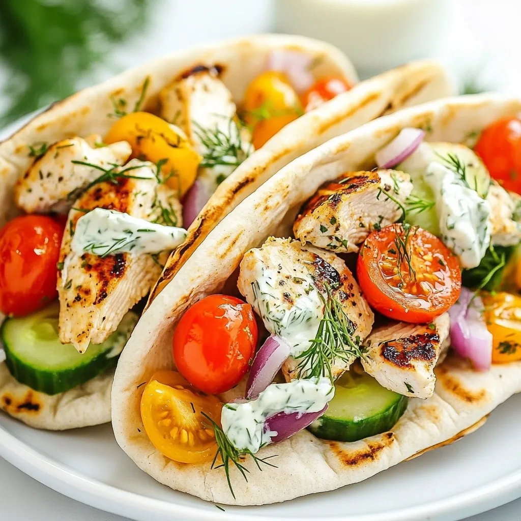 - 2 boneless, skinless chicken breasts - 2 tablespoons olive oil - 2 teaspoons dried oregano - 1 teaspoon garlic powder - Salt and pepper to taste For the chicken marinade, I use just a few simple ingredients. First, I take boneless, skinless chicken breasts, which are perfect for this dish. I add olive oil to keep the chicken juicy. Next, I sprinkle dried oregano for that classic Greek flavor. Garlic powder adds a nice kick, while salt and pepper bring everything together. This marinade makes the chicken tasty and tender. - 4 whole wheat pita pockets - 1 cup cherry tomatoes, halved - 1 cucumber, diced - 1/2 red onion, thinly sliced Now, let's talk about the filling. I always choose whole wheat pita pockets for a healthy twist. They are soft and hold the filling well. I use fresh cherry tomatoes for sweetness. Diced cucumber adds crunch, and thinly sliced red onion gives a bit of zing. Together, these ingredients make the pita pockets colorful and fresh. - Store-bought options vs. homemade - Garnish suggestions (fresh dill or parsley) Tzatziki sauce is a must-have for these pockets. You can buy it at the store, or you can make it at home if you want. Homemade tzatziki tastes so fresh and creamy. You can use yogurt, cucumber, garlic, and herbs. For garnish, I like to sprinkle some fresh dill or parsley on top. It makes the dish look pretty and adds more flavor. {{ingredient_image_1}} - To start, mix olive oil, oregano, garlic powder, salt, and pepper in a bowl. - Take the chicken breasts and coat them well with the marinade. - Cover the bowl and refrigerate for at least 30 minutes. If you have more time, let it sit for up to 2 hours. This adds great flavor to the chicken. - Preheat your grill or skillet to medium-high heat. - Once hot, take the chicken out of the marinade. Discard any leftover marinade. - Cook the chicken for about 6-7 minutes on each side. The chicken is ready when the internal temperature hits 165°F (75°C). - Let the chicken rest for 5 minutes before slicing. This keeps it juicy. - While the chicken rests, grab a medium bowl. Combine halved cherry tomatoes, diced cucumber, and sliced red onion. - Toss the vegetables gently to mix them. Fresh veggies bring bright flavors to your pita. - Slice the pita pockets in half to create a pocket. - Start by adding 3-4 slices of grilled chicken to each pocket. - Then, layer in the vegetable mixture generously. - Finally, spoon tzatziki sauce into each pocket. Make sure it spreads well. Enjoy your Greek Chicken Pita Pockets! They are easy to make and packed with flavor. To make your chicken burst with flavor, marination is key. I like to mix olive oil, dried oregano, garlic powder, salt, and pepper in a bowl. This creates a tasty marinade. Make sure the chicken breasts are fully coated. Cover the bowl and let it sit in the fridge. For great flavor, marinate for at least 30 minutes or up to 2 hours. The longer you wait, the more flavor the chicken absorbs. You can cook the chicken in different ways. Grilling gives a nice smoky taste, while a skillet works well too. Just preheat your grill or skillet to medium-high heat. Cook the chicken for about 6-7 minutes on each side. Check the internal temperature; it should reach 165°F (75°C). After cooking, let the chicken rest for 5 minutes. This step keeps it juicy and tender. When it comes to sides, think fresh salads or dips. A Greek salad pairs great with these pita pockets. For serving, slice the pita pockets in half. Fill them with 3-4 slices of chicken and add your veggie mix. Spoon in some tzatziki sauce for creaminess. For a bit of flair, sprinkle fresh dill or parsley on top. This makes your meal look colorful and appealing. Pro Tips Marinate for Maximum Flavor: Allow the chicken to marinate for at least 2 hours if possible. This enhances the flavor and tenderness of the chicken significantly. Use a Meat Thermometer: To ensure your chicken is perfectly cooked, use a meat thermometer. The internal temperature should reach 165°F (75°C). Customize Your Vegetables: Feel free to add or substitute your favorite vegetables in the pita pockets, such as bell peppers or spinach, for added nutrition and flavor. Make It Ahead: You can grill the chicken and prepare the vegetable mixture ahead of time. Just assemble the pita pockets right before serving to keep everything fresh. {{image_2}} You can easily swap chicken for tofu or shrimp. Tofu is great for a vegetarian option. Just press it to remove extra water, then marinate it like the chicken. Shrimp cooks quickly and brings a nice flavor too. It’s fun to explore these choices based on your diet. Add feta cheese or olives for a salty twist. Both options boost the dish's flavor. Fresh herbs like dill or parsley add freshness. You can also mix in different veggies. Try bell peppers, spinach, or radishes to keep it exciting. The more colors, the better! You can switch up your sauce for a new taste. Hummus or tahini can be great options. They add creaminess and a unique flavor. If you want tzatziki, try adding mint or lemon zest. These little changes make a big difference! To store your Greek chicken pita pockets, place them in an airtight container. This keeps them fresh. You can also wrap them tightly in plastic wrap. Aim to refrigerate them within two hours of cooking. This helps prevent bacteria growth. Your leftovers will stay good for about 3 days in the fridge. To reheat the chicken and vegetables, use a microwave or skillet. If using a microwave, place the chicken on a plate. Heat it for about 1-2 minutes. Check to ensure it’s warm all the way through. If using a skillet, add a little olive oil and heat over medium. Cook for about 5 minutes, stirring often. This keeps the chicken moist and tasty. Yes, you can freeze pita pockets! To freeze them, wrap each pocket tightly in plastic wrap. Then, place them in a freezer bag. This helps prevent freezer burn. They can last up to 3 months in the freezer. When ready to eat, thaw them ove