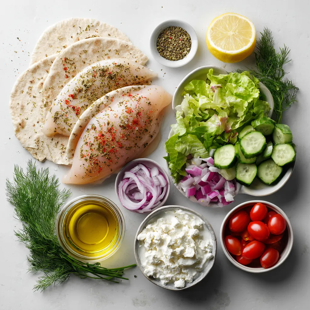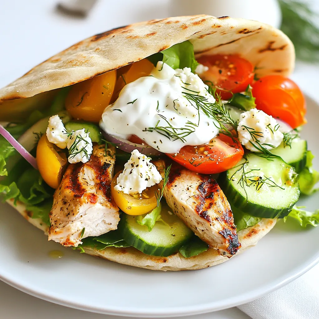 - 2 boneless, skinless chicken breasts - 4 whole wheat pita pockets - 1 cup cherry tomatoes, halved - 1 cucumber, diced - 1/2 red onion, thinly sliced - 1 cup romaine lettuce, chopped - 1/2 cup Greek yogurt - 1/4 cup feta cheese, crumbled - 2 tablespoons olive oil - 1 teaspoon dried oregano - 1 teaspoon garlic powder - 1 teaspoon paprika - Salt and pepper to taste - Fresh dill for garnish - Extra lemon juice When I make Greek Chicken Pita Pockets, I focus on fresh, high-quality ingredients. The chicken provides protein, while the veggies add crunch and flavor. Whole wheat pita pockets are healthy and filling. Greek yogurt and feta cheese bring a creamy, tangy touch that ties everything together. The marinade is simple but essential. I love using olive oil, oregano, garlic powder, and paprika. These spices enhance the chicken’s taste and keep it juicy. Adding salt and pepper is key to bringing out all the flavors. For garnishes, fresh dill adds a nice touch. A squeeze of lemon juice brightens the dish and enhances the taste. This meal is not only quick to prepare, but it also bursts with flavor. You'll enjoy every bite! {{ingredient_image_1}} To start, we need to marinate the chicken. This step adds a lot of flavor. - In a bowl, mix together: - 2 tablespoons olive oil - 1 teaspoon dried oregano - 1 teaspoon garlic powder - 1 teaspoon paprika - Salt and pepper to taste Make sure to blend these ingredients well. - Next, coat the chicken breasts in this marinade. Let the chicken sit for at least 30 minutes. If you have more time, letting it marinate for 2 hours makes it even tastier. Now, it’s time to cook the chicken. - Preheat your grill or grill pan over medium-high heat. This helps the chicken cook evenly. - Cook the marinated chicken for about 6-7 minutes on each side. Use a meat thermometer to check that the chicken reaches 165°F (75°C). Once cooked, remove it from the heat and let it rest for a few minutes. This keeps the chicken juicy. While the chicken rests, we can prepare the filling. - In a large bowl, combine: - 1 cup cherry tomatoes, halved - 1 cucumber, diced - 1/2 red onion, thinly sliced - 1 cup romaine lettuce, chopped - 1/4 cup feta cheese, crumbled Toss these fresh veggies gently to mix them. - Slice the cooked chicken into strips and add it to the bowl. Drizzle with 2 tablespoons of fresh lemon juice. You can add more salt and pepper if you like. Mix everything well. The last step is assembling the pita pockets. - Warm the pita pockets in the oven for about 5 minutes, or until soft. This makes them easier to fill. - Carefully open each pita pocket and fill it with the chicken and vegetable mix. Top it with a dollop of Greek yogurt and garnish with fresh dill if you want. Enjoy your tasty Greek Chicken Pita Pockets! - Recommended marinating time: I suggest marinating the chicken for at least 30 minutes. For more flavor, let it sit for up to 2 hours. - Alternative marinade options: If you want to mix it up, try using yogurt as a base. You can also add lemon zest or herbs like thyme for a fresh twist. - Ensuring the chicken is cooked through: Use a meat thermometer to check the chicken. It should reach 165°F (75°C) inside. This keeps it safe and juicy. - Best practices for grilling chicken: Preheat your grill or pan to medium-high heat. This helps get nice grill marks and keeps the chicken from sticking. - How to properly fill pita pockets: Open each pita gently. Fill them with chicken and veggies, but don’t overstuff. This helps prevent spills. - Serving suggestions: Serve with a side of extra lemon wedges or a simple salad. This adds freshness and color to your plate. Pro Tips Marinate for Maximum Flavor: Allow the chicken to marinate for at least 2 hours. This enhances the flavor and tenderness of the meat. Perfectly Cooked Chicken: Use a meat thermometer to check that the chicken reaches an internal temperature of 165°F (75°C) for safe consumption. Warm Pita for Softness: Warm the pita pockets in the oven just before serving to make them soft and pliable, making it easier to fill them. Fresh Ingredients Matter: Use fresh, high-quality vegetables and herbs for the best taste and nutritional value in your pita pockets. {{image_2}} You can easily swap chicken for chickpeas or grilled vegetables. Chickpeas add protein and fiber. Simply toss canned chickpeas with olive oil, lemon juice, and spices. For grilled veggies, try zucchini, bell peppers, or eggplant. Grill them until soft and charred. To change up the taste, add different spices or herbs. Try cumin or coriander for warmth. Fresh herbs like parsley or mint can brighten flavors. You can also use flavored Greek yogurt. Add herbs or garlic to plain yogurt for a tasty twist. Serve your Greek chicken as a salad instead of in pita pockets. Use the same filling and toss it with greens. You can also serve pita pockets with sides. Try hummus, tzatziki, or a fresh Greek salad. These pair well and add extra flavor. To keep your Greek Chicken Pita Pockets fresh, store them properly. First, remove the filling from the pita. This helps prevent the bread from getting soggy. Place the chicken and vegetables in an airtight container. You can store them in the fridge for up to three days. For the pitas, wrap them in foil or plastic wrap. They can last about two days in the fridge. When it's time to enjoy your leftovers, reheat the chicken and veggies carefully. The best way is in a skillet over medium heat. Stir them for about five to seven minutes until they are warm. You can also use the microwave. Heat in 30-second intervals until warm. Don't forget to check the chicken's temperature. It should be at least 165°F (75°C) to be safe to eat. If you want to save your Greek Chicken Pita Pockets for later, freezing is a great option. You can freeze the cooked chicken and filling separately. Place them in freezer-safe containers or bags. They can stay fresh for up to three months. When you are ready to eat, thaw them in the f