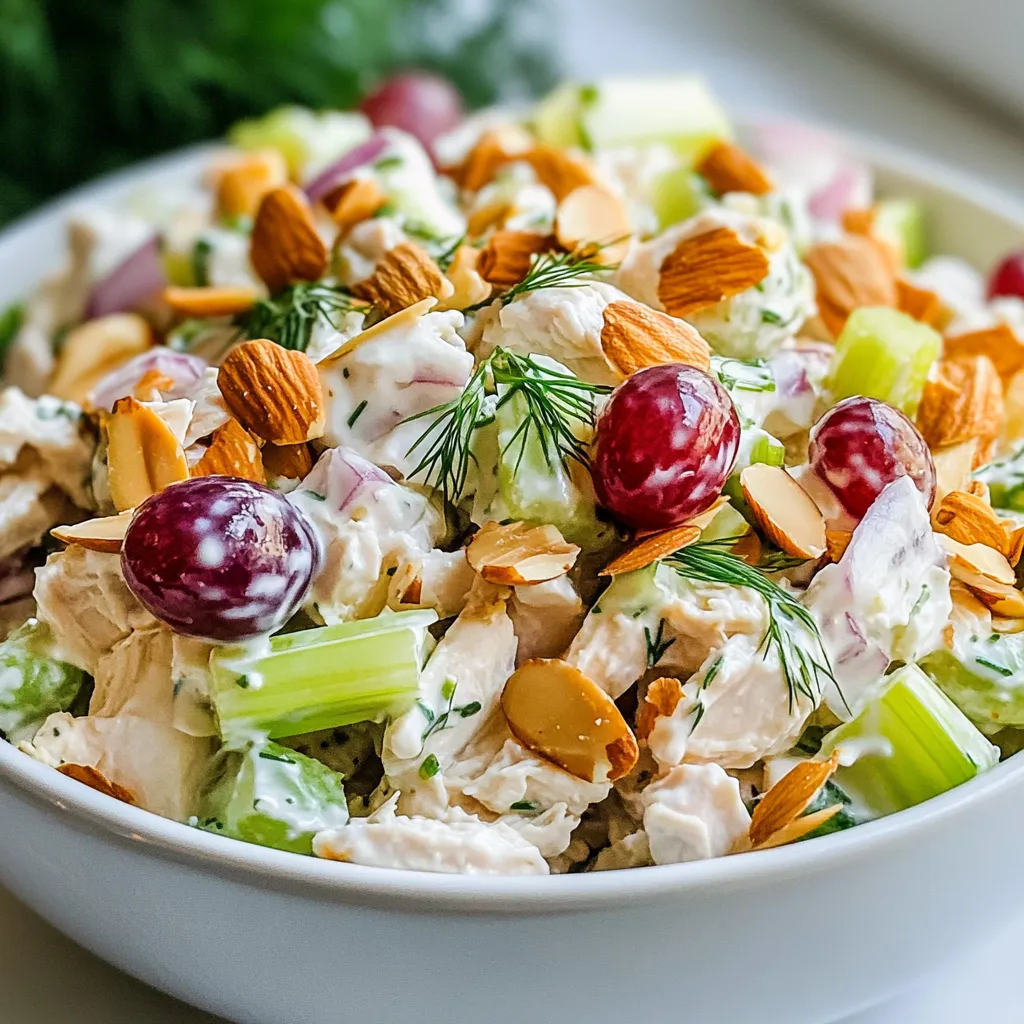 I like to mix in finely chopped celery for a nice crunch. Halved red grapes add a pop of sweetness that balances the flavors. Slivered almonds provide another layer of crunch, while red onion gives a sharp bite.