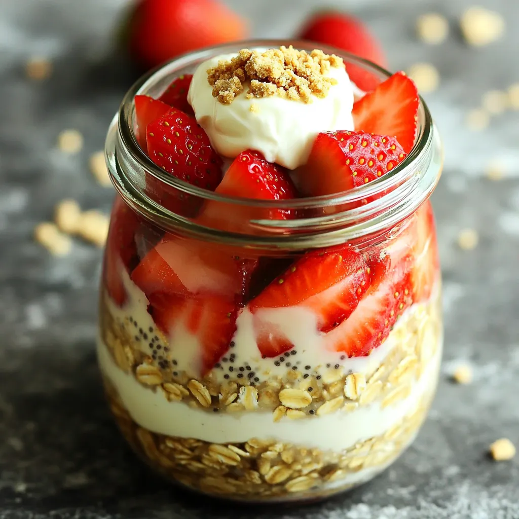 This recipe for overnight oats mixes convenience and taste. You start with rolled oats, almond milk, and Greek yogurt for a healthy base. Adding strawberries and cream cheese gives it a creamy twist. Adjust sweetness and toppings to fit your taste.