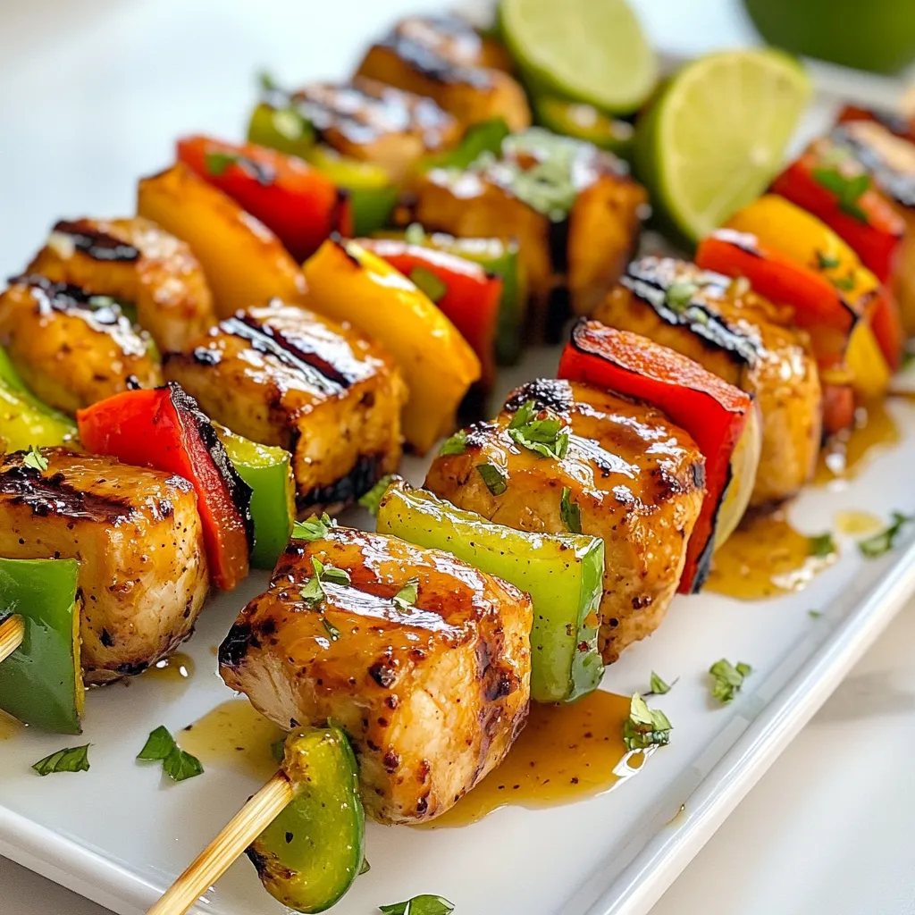 Delicious grilled chicken kabobs marinated in a sweet and tangy honey lime sauce, paired with colorful vegetables.