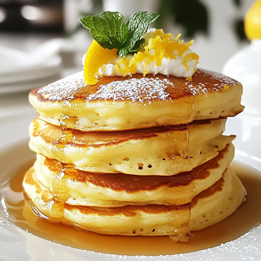 To make lemon ricotta pancakes, gather these fresh ingredients: - 1 cup ricotta cheese - 1 cup all-purpose flour - 2 tablespoons sugar - 1 tablespoon baking powder - ½ teaspoon salt - 1 cup milk - 2 large eggs - Zest of 1 lemon - 2 tablespoons fresh lemon juice - 1 teaspoon vanilla extract - Butter or oil for cooking Using fresh ingredients makes a big difference. Fresh ricotta adds creaminess and flavor. Fresh lemon zest and juice give bright notes. They wake up your taste buds. When you use fresh ingredients, your pancakes taste better and feel lighter. You want your breakfast to be delightful and energizing. If you don't have some ingredients, don't worry! You can swap them out. For example, if you lack ricotta, try cottage cheese. It gives a similar texture. You can also use whole wheat flour instead of all-purpose flour for a healthier option. If you want a dairy-free version, use almond milk and a dairy-free ricotta. Just remember, these changes can alter the taste and texture a bit. Enjoy experimenting! {{ingredient_image_1}} Start with the ricotta cheese. Place one cup in a large bowl. Then add one cup of milk, two large eggs, the zest of one lemon, two tablespoons of fresh lemon juice, and one teaspoon of vanilla extract. Whisk everything until it is smooth. In another bowl, mix together one cup of all-purpose flour, two tablespoons of sugar, one tablespoon of baking powder, and half a teaspoon of salt. Combine these dry ingredients slowly with the wet mixture. Stir gently until just mixed. It’s okay if the batter has some lumps. Heat a non-stick skillet over medium heat. Add a small amount of butter or oil to coat the pan. For each pancake, pour a 1/4 cup of batter onto the skillet. Cook for about 3 to 4 minutes. Look for bubbles forming on top and the edges looking set. Once you see these signs, flip the pancake. Cook for another 2 to 3 minutes until the pancake is golden brown. Repeat this process for the rest of the batter, adding more butter or oil as needed. Serve the pancakes warm. Drizzle them with maple syrup for sweetness. You can also top them with fresh berries for a fruity touch. A dusting of powdered sugar adds a nice finish. For a fun twist, stack the pancakes high and garnish with more lemon zest and a dollop of whipped cream. Add a few mint leaves for a pop of color and flavor. Enjoy your delicious breakfast! To make your lemon ricotta pancakes light and fluffy, use fresh ricotta cheese. The creaminess adds moisture and richness. When mixing the batter, don’t overmix. A few lumps are okay. This helps keep the pancakes airy. Let the batter rest for a few minutes before cooking. This small step can make a big difference. Heat your non-stick skillet to medium. If it’s too hot, the pancakes will burn. If it’s too low, they won’t cook through. You can test the heat by sprinkling a drop of water on the skillet. If it sizzles and dances, it’s ready. Add a bit of butter or oil to keep the pancakes from sticking. Store leftover pancakes in an airtight container in the fridge. They will stay fresh for up to three days. To reheat, place them in the toaster or microwave. For the toaster, aim for medium heat. For the microwave, heat in 30-second bursts. You want them warm, not hot. Enjoy your pancakes again with a fresh drizzle of syrup! Pro Tips Use Room Temperature Ingredients: Bring your eggs and ricotta to room temperature before mixing for a smoother batter and fluffier pancakes. Don’t Overmix: Mixing too much can lead to dense pancakes. Stir until just combined to keep them light and airy. Perfect Cooking Temperature: Ensure your skillet is at medium heat; too hot can burn the pancakes while leaving the inside uncooked. Flavor Variations: Experiment with adding blueberries or chocolate chips to the batter for a delicious twist on the classic lemon ricotta pancake. {{image_2}} You can make lemon ricotta pancakes even better with fun flavors. Try adding blueberries for a fruity twist. They burst with juice and taste great. Chocolate chips are another fun option. They melt and add sweetness. You can also mix in nuts like walnuts or pecans. They give a nice crunch and flavor. Experiment with different flavors to find your favorite! Toppings can change your pancake game. Greek yogurt adds creaminess and tang. It pairs well with the lemon flavor. Fresh fruit is also a great choice. Strawberries, raspberries, or bananas work well. You can make a fruit compote by cooking down fruit with a little sugar. This creates a sweet sauce to drizzle on top. Maple syrup is a classic, but consider honey or agave for a different touch. If you need gluten-free pancakes, it's easy to adapt this recipe. Swap the all-purpose flour with a gluten-free flour blend. Make sure the blend has a good texture for baking. You may need to add a bit more liquid to the batter. Use almond milk or coconut milk if you want a dairy-free option. These changes keep your pancakes fluffy and delicious! To keep your lemon ricotta pancakes fresh, store them in the fridge. Place the pancakes in an airtight container. You can also use plastic wrap. Make sure they cool down before sealing. This way, they won’t get soggy. For longer storage, freeze your pancakes. Let them cool completely first. Then, stack them with parchment paper in between each one. Place the stack in a freezer bag or bowl. Make sure to remove as much air as possible. This helps keep them fresh and prevents freezer burn. In the fridge, these pancakes last about 3 to 4 days. If you freeze them, they can last for up to 2 months. Just reheat in a microwave or toaster oven when you are ready to enjoy them again. This way, you can have a tasty breakfast anytime! Lemon ricotta pancakes are fluffy pancakes made with ricotta cheese and lemon. They have a light, airy texture and a bright lemon flavor. The ricotta adds creaminess, while the lemon zest and juice give them a fresh taste. These pancakes are perfect for breakfast or brunch. You ca