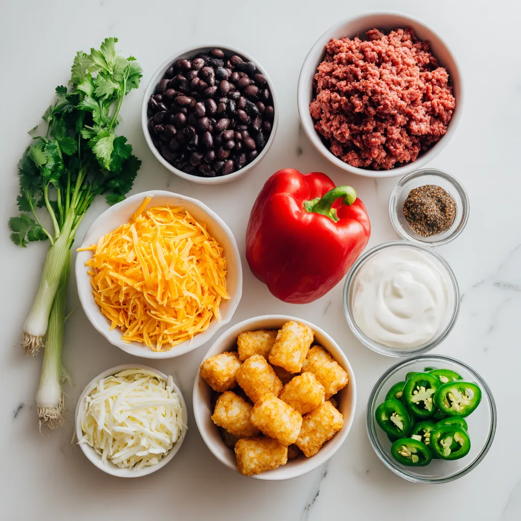 A delicious and hearty casserole featuring ground beef, black beans, corn, and tater tots, topped with melted cheddar cheese.