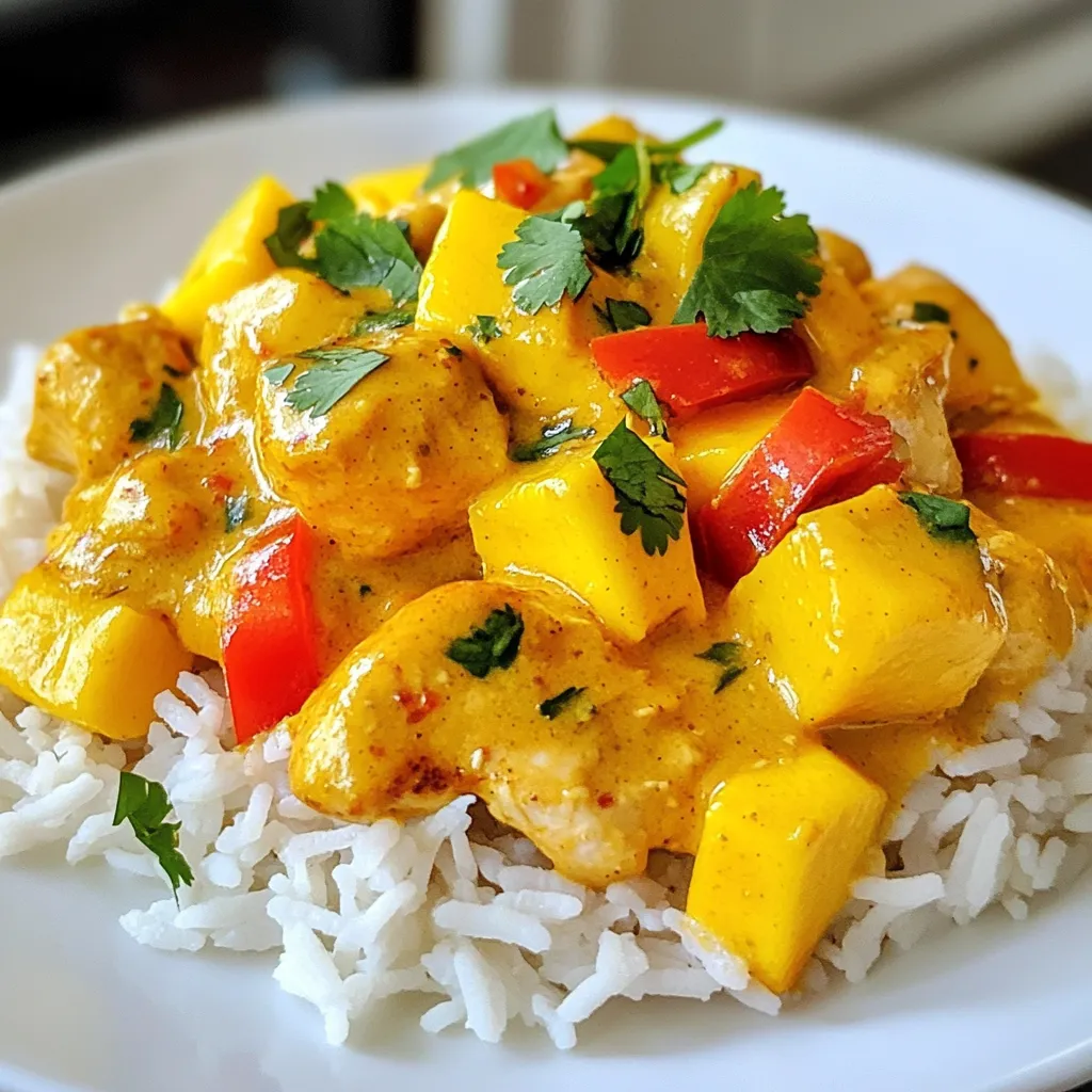 - 1 lb (450g) chicken breasts, cubed - 1 ripe mango, pureed - 1 can (14 oz) coconut milk - 1 medium onion, finely chopped - 3 cloves garlic, minced - 1-inch piece of ginger, minced - 2 tablespoons curry powder - 1 tablespoon olive oil - 1 tablespoon lime juice - Salt and pepper to taste - Fresh cilantro for garnish - 1 red bell pepper, sliced - 1 tablespoon honey (optional for sweetness) In this dish, chicken breasts are the star. They soak up all the tasty flavors. The ripe mango adds a sweet and creamy touch. Coconut milk makes it rich and smooth. Together, these main ingredients create a great base for the curry. Now, let’s talk about the extra ingredients. Chopped onion, minced garlic, and ginger start the flavor party. They add warmth and depth. Curry powder brings that classic spice mix, filling the air with an amazing aroma. Olive oil helps cook everything perfectly. You can add honey if you want a sweeter dish. It balances the spices well. The red bell pepper adds color and crunch. Fresh cilantro on top gives a nice finish. These ingredients work together to make a dish that is both simple and packed with flavor. {{ingredient_image_1}} 1. First, heat 1 tablespoon of olive oil in a large skillet over medium heat. 2. Add 1 medium onion, finely chopped. Sauté until it turns translucent, about 5 minutes. 3. Next, add 3 cloves of minced garlic and 1-inch piece of minced ginger. Cook for 2 more minutes until you smell the aroma. 4. Now, stir in 2 tablespoons of curry powder. Allow the spices to bloom for 1 minute. 1. Add 1 pound of cubed chicken breasts to the pan. Sauté until browned on all sides, which should take about 6 to 8 minutes. 2. Pour in the 1 ripe mango, pureed, and 1 can of coconut milk. Mix everything well. 3. Bring the mixture to a gentle simmer. 1. Add 1 sliced red bell pepper to the skillet. Cook for 10 to 15 minutes. This lets the chicken cook through and become tender. 2. Stir in 1 tablespoon of lime juice. This step balances the flavors. 3. Season with salt and pepper to taste. 4. Finally, remove from heat and garnish with fresh cilantro before serving. Enjoy your Mango Curry Chicken over jasmine rice for a delightful meal! To get the best texture for chicken, cut it into small, even cubes. This helps it cook evenly. Sauté the chicken until it's browned on all sides. This step adds a nice flavor. Keep the heat at medium to avoid burning. For flavor enhancement, add garlic and ginger early. This allows their flavors to bloom. Use fresh ingredients whenever possible. Fresh garlic and ginger make a big difference. If you want extra sweetness, try adding honey. It pairs well with the mango. When serving Mango Curry Chicken, a bed of jasmine rice works well. The rice soaks up the sauce, adding flavor. Drizzle extra coconut milk on top for a creamy touch. For garnishing ideas, add fresh cilantro for color and freshness. You can also sprinkle some sliced red bell pepper on the dish. This adds a pop of color and crunch. Consider using lime wedges on the side. They add a bright burst of flavor when squeezed over the dish. Pro Tips Use Fresh Mango: For the best flavor, opt for a ripe, fresh mango rather than canned puree. This will enhance the dish's sweetness and freshness. Adjust Spice Level: If you prefer a spicier curry, consider adding a pinch of cayenne pepper or diced chili peppers with the garlic and ginger. Let it Simmer: Allowing the curry to simmer longer can deepen the flavors. Just make sure to check the chicken for doneness. Garnish Generously: Fresh cilantro adds not only color but also a burst of flavor. Don’t skimp on the garnish for a restaurant-quality presentation. {{image_2}} You can change the protein in this dish. If you prefer tofu, use firm tofu instead of chicken. Just cube it and cook it the same way. Shrimp is another great choice. Cook it until pink and tender. You can also swap the mango. Pineapple adds a sweet twist. Peaches can bring a nice touch too. For veggies, try adding zucchini or carrots. They will add crunch and color. Want more heat? Add red pepper flakes or fresh chili. You can also use hot curry powder for a kick. If you prefer it milder, leave out the red pepper. Use sweet curry powder to keep it gentle. Different curry powders can change the flavor. Garam masala adds warmth and depth. Thai curry powder brings a different vibe. Experiment with what you have in your spice rack! Mango curry chicken lasts in the fridge for up to four days. Store it in an airtight container. Glass or plastic containers work well. This keeps the dish fresh and tasty. Always let it cool down before storing. To freeze mango curry chicken, first, let it cool completely. Then, transfer it to a freezer-safe bag or container. Remove as much air as possible. This prevents freezer burn and keeps the flavor. You can freeze it for up to three months. When you’re ready to eat, thaw it in the fridge overnight. Reheat it in a skillet over low heat. Add a splash of water or coconut milk to keep it moist. Stir well and heat until warm. This keeps the dish delicious and enjoyable. You can serve Mango Curry Chicken with several tasty sides. Here are my top picks: - Jasmine rice: It soaks up the delicious curry sauce well. - Quinoa: This adds a nutty flavor and boosts nutrition. - Naan bread: Use it to scoop up the curry for a fun experience. - Steamed veggies: Broccoli or green beans add color and crunch. - Cucumber salad: This fresh side cools the palate and adds a crunchy contrast. These sides will make your meal more enjoyable and balanced. Yes, you can make this dish dairy-free easily. Instead of coconut milk, use: - Almond milk: This gives a light, nutty flavor. - Soy milk: A good option, but choose unsweetened for best taste. - Cashew cream: A rich and creamy choice that adds depth. Each alternative works well, so choose what you like best! To check if the chicken is cooked, use these tips: - Color check: The chicken should be white and no longer pink insi