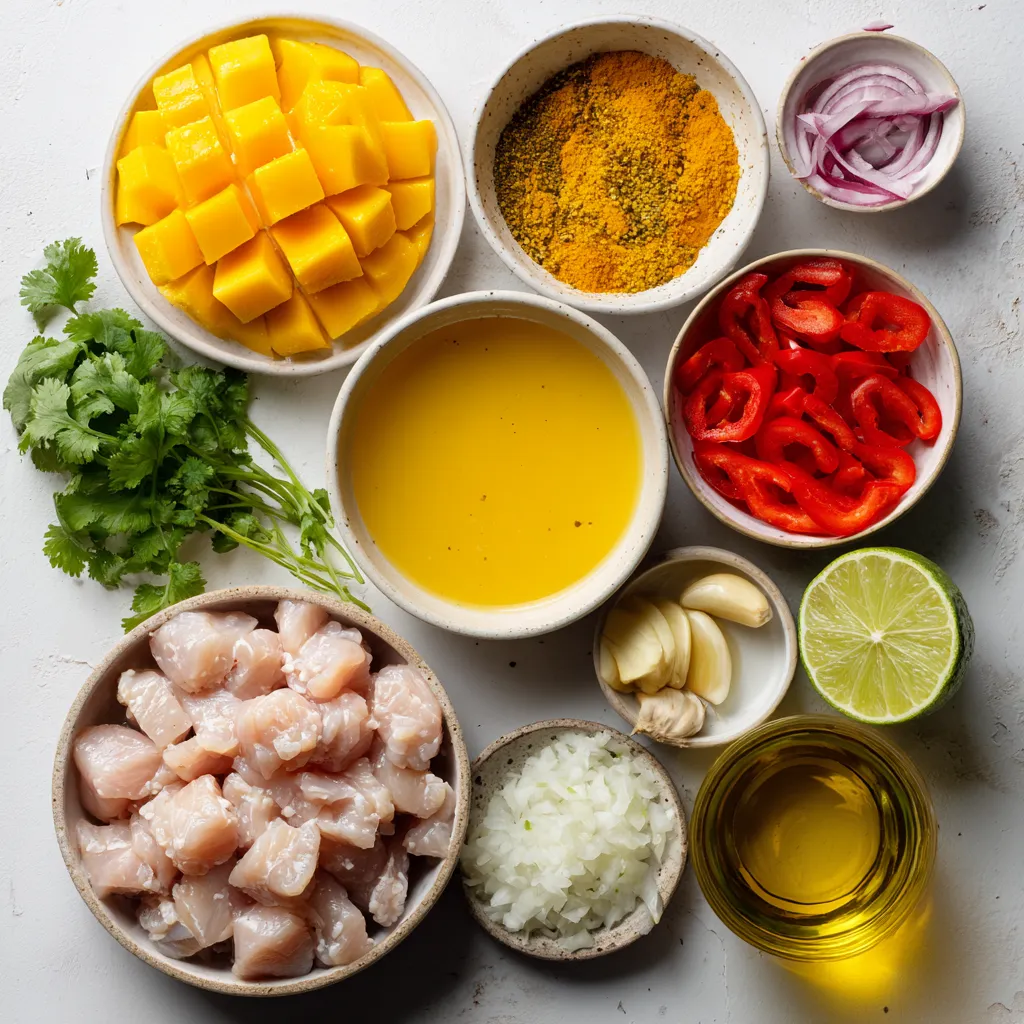 In this dish, chicken breasts are the star. They soak up all the tasty flavors. The ripe mango adds a sweet and creamy touch. Coconut milk makes it rich and smooth. Together, these main ingredients create a great base for the curry.