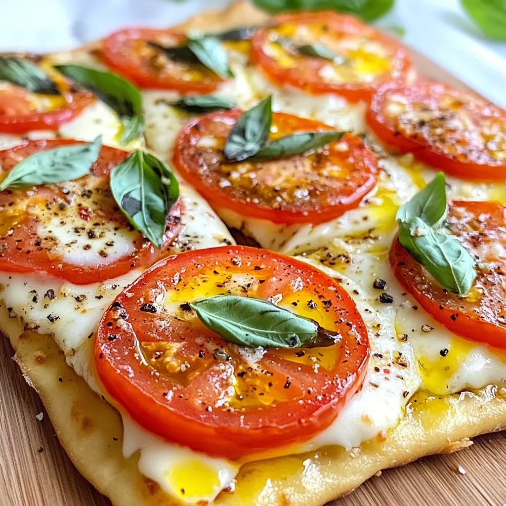 A delicious and easy-to-make flatbread pizza topped with fresh mozzarella, tomatoes, and basil.