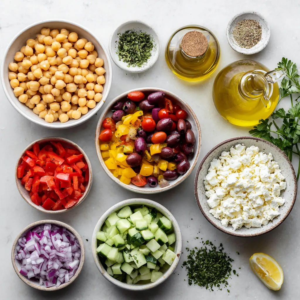 These fresh ingredients make this salad bright and colorful. Chickpeas are the base. They give protein and fiber. Cherry tomatoes add sweetness. Cucumbers bring a crisp bite. Red onion adds crunch and flavor. Bell peppers give color and more taste. Kalamata olives bring a briny touch. Feta cheese adds a creamy, salty flavor. Fresh parsley ties everything together with its green freshness.