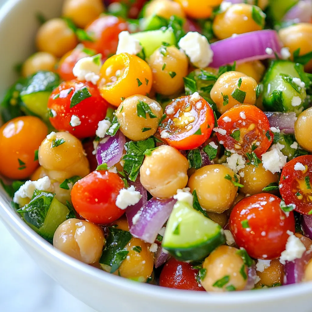 A refreshing salad packed with chickpeas, vegetables, and a tangy dressing.