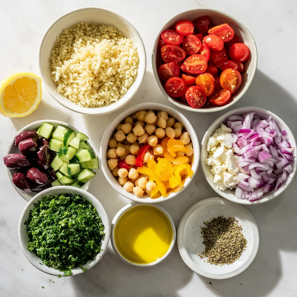 I love gathering fresh ingredients for my Mediterranean quinoa salad. Each item brings vibrant colors and flavors. First, I use quinoa as a base. It’s a super grain that gives a nice texture. I rinse it to remove any bitterness.