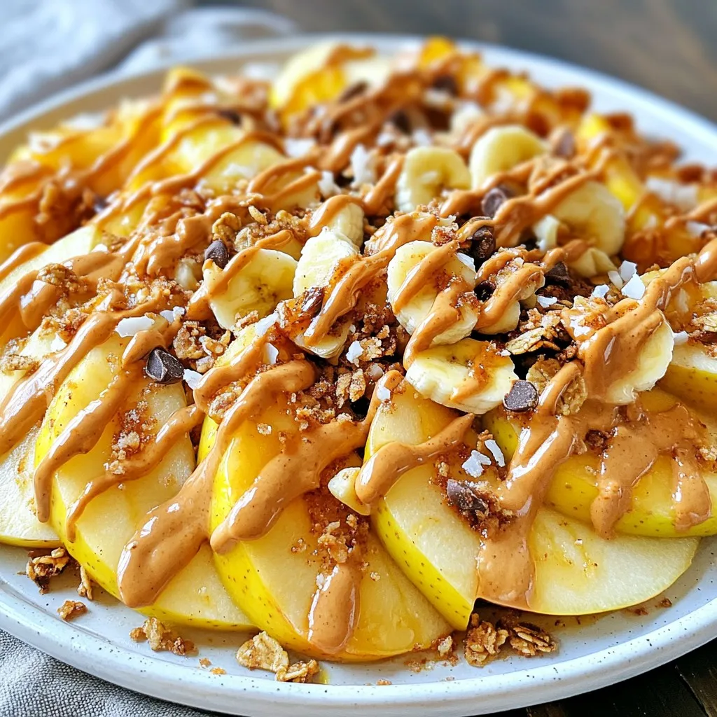 With the apple slices ready and the peanut butter drizzled, it’s time to layer the other ingredients. Start by sprinkling a quarter cup of granola evenly over the apples. This adds crunch. Then, toss in a quarter cup of mini chocolate chips for a sweet touch. Next, drizzle honey or maple syrup over the entire platter. This gives a nice shine and sweetness. Finish with a sprinkle of cinnamon and a pinch of sea salt. These add depth to the taste. If you want, consider adding optional toppings like sliced bananas, coconut flakes, or chopped nuts. Now, your peanut butter apple nachos are ready to serve and enjoy!