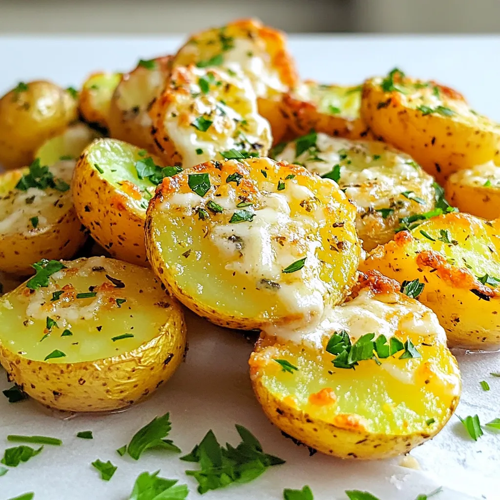 Start by washing 2 pounds of baby potatoes. Halve them to help with cooking. Next, mince 6 cloves of garlic. This adds great flavor. In a large bowl, mix the halved potatoes, 4 tablespoons of olive oil, minced garlic, 2 teaspoons of dried Italian herbs, salt, and pepper. Toss everything well until the potatoes are coated.