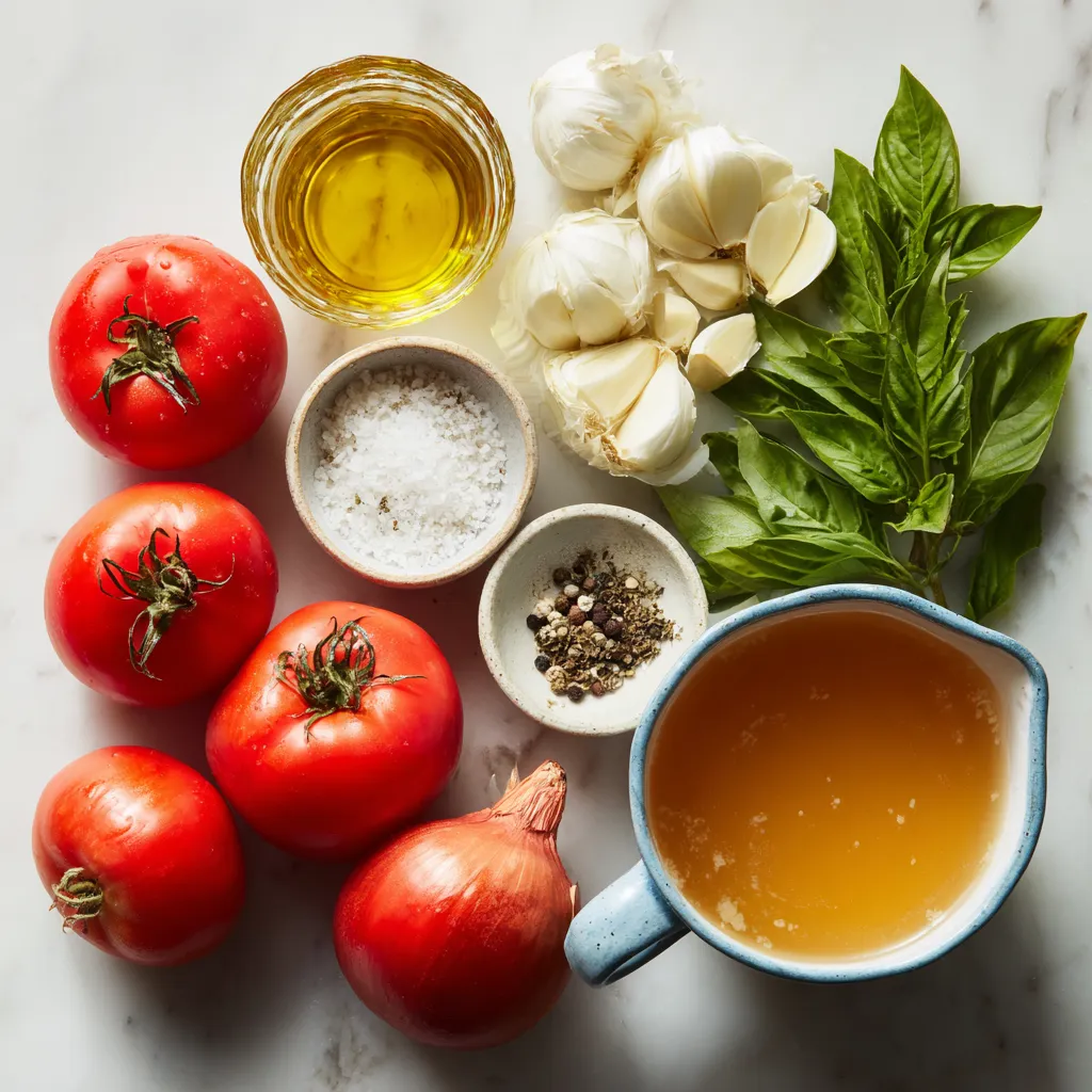 In this recipe, ripe tomatoes are key. They add sweetness and depth. Onions and garlic bring a strong, savory flavor. Olive oil helps to roast the veggies and adds richness. Seasonings like salt, pepper, and sugar balance the tastes. Vegetable broth gives the soup a nice body. Fresh basil adds that classic taste you expect. If you want a creamy soup, heavy cream works well. Garnishes like fresh basil and croutons make it look great.